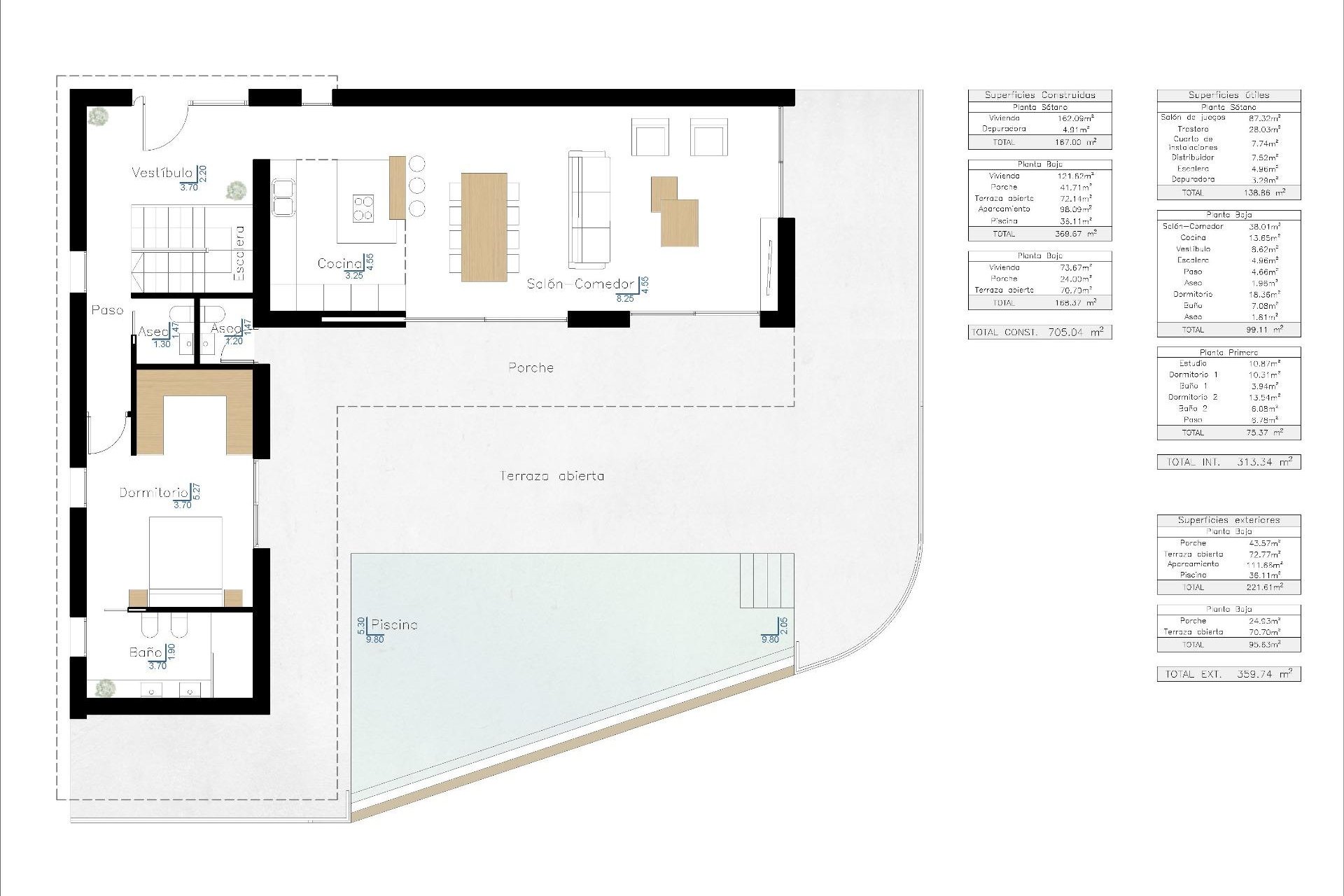 NEW BUILD VILLA WITH THE SEA VIEWS IN BENISSA New Build project on the Benissa coast located very close to the beautiful La Fustera beach and shops, restaurants and services, all less than approximately 300m away. New Build villa exclusive and modern designed with functional architecture creating practical and aesthetically pleasing spaces, is distributed over 3 floors that rise on a 1,040m2 plot with sea views, The villa has three 3 (2 of them en-suite), 3 full bathrooms, a guest toilet and an exterior toilet, a kitchen with an island an open-concept living-dining room creating a unique and open-plan room. Also a large laundry room and multipurpose room. There is the possibility of creating a fourth en-suite bedroom on the basement floor Modern kitchen with laminated or lacquered doors, soft-closing drawers, porcelain bench, includes space between the bench and tall cabinets. Appliances included: oven, micro, ceramic hob, extractor hood, fridge and Bosch brand dishwasher or similar. Outside is the 40m2 pool surrounded by a large terrace and low-maintenance designer gardens with automatic irrigation. In addition, the villa also has a large stamped concrete parking lot, covered by a high-quality canvas awning. Benissa is located towards the northern end of the Costa Blanca, just off the A-7 Motorway; the trip to and from Alicante airport takes just over one hour. The town is small, but enchanting with its medieval architecture and charming plazas. Although only 5 km distance from the sea – as the crow flies, the nearest beaches by road are approximately 11 km away and the seaside towns of Calpe (to the south) and Moraira (to the north east) are approximately 12 km distance. The views of the Mediterranean, the weather, wild nature, the quality of the light, the towns architecture, Benissa will seduce you. Alicante airport located 1 hour away.