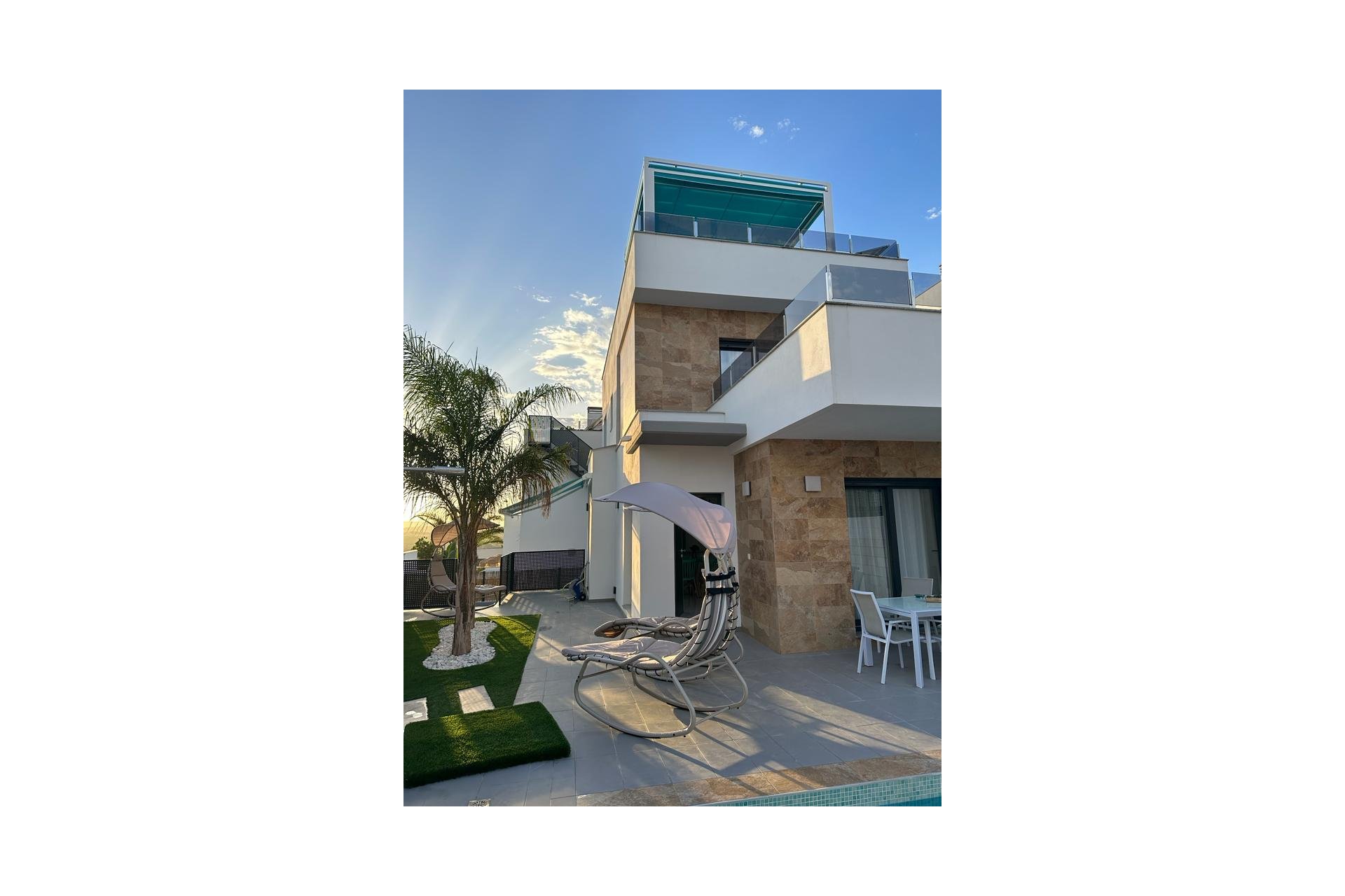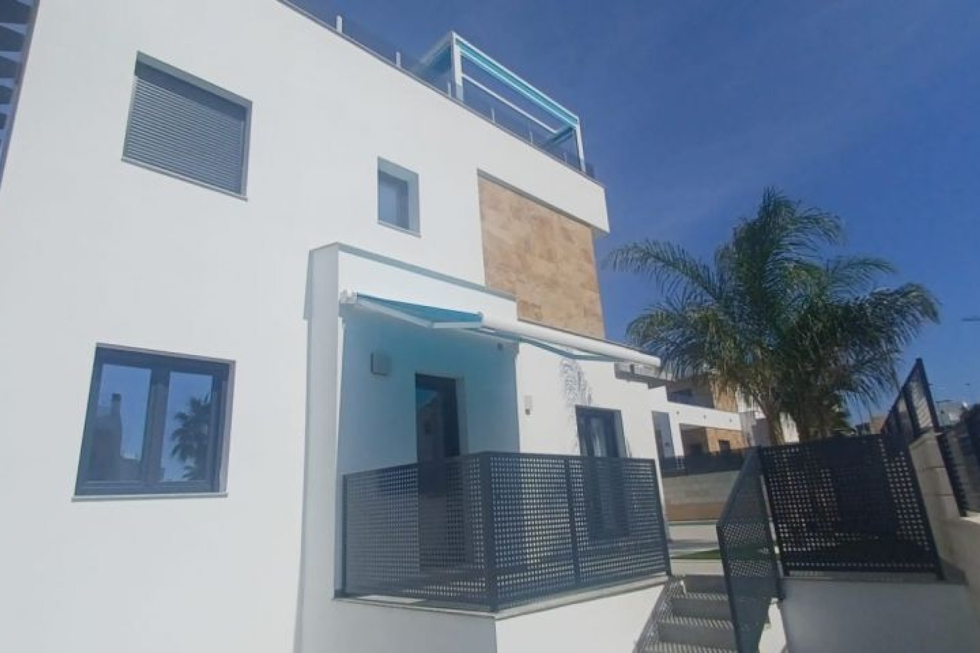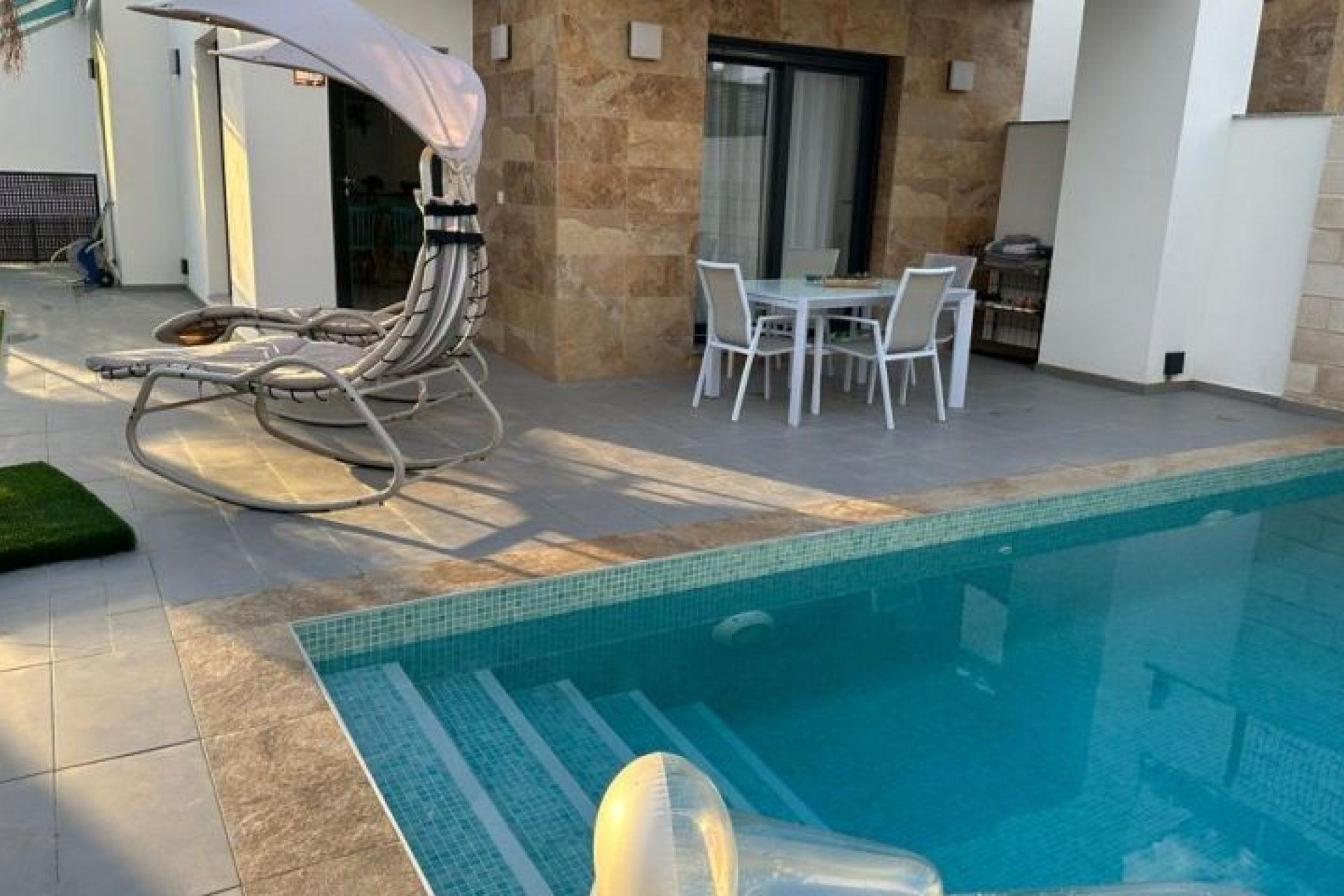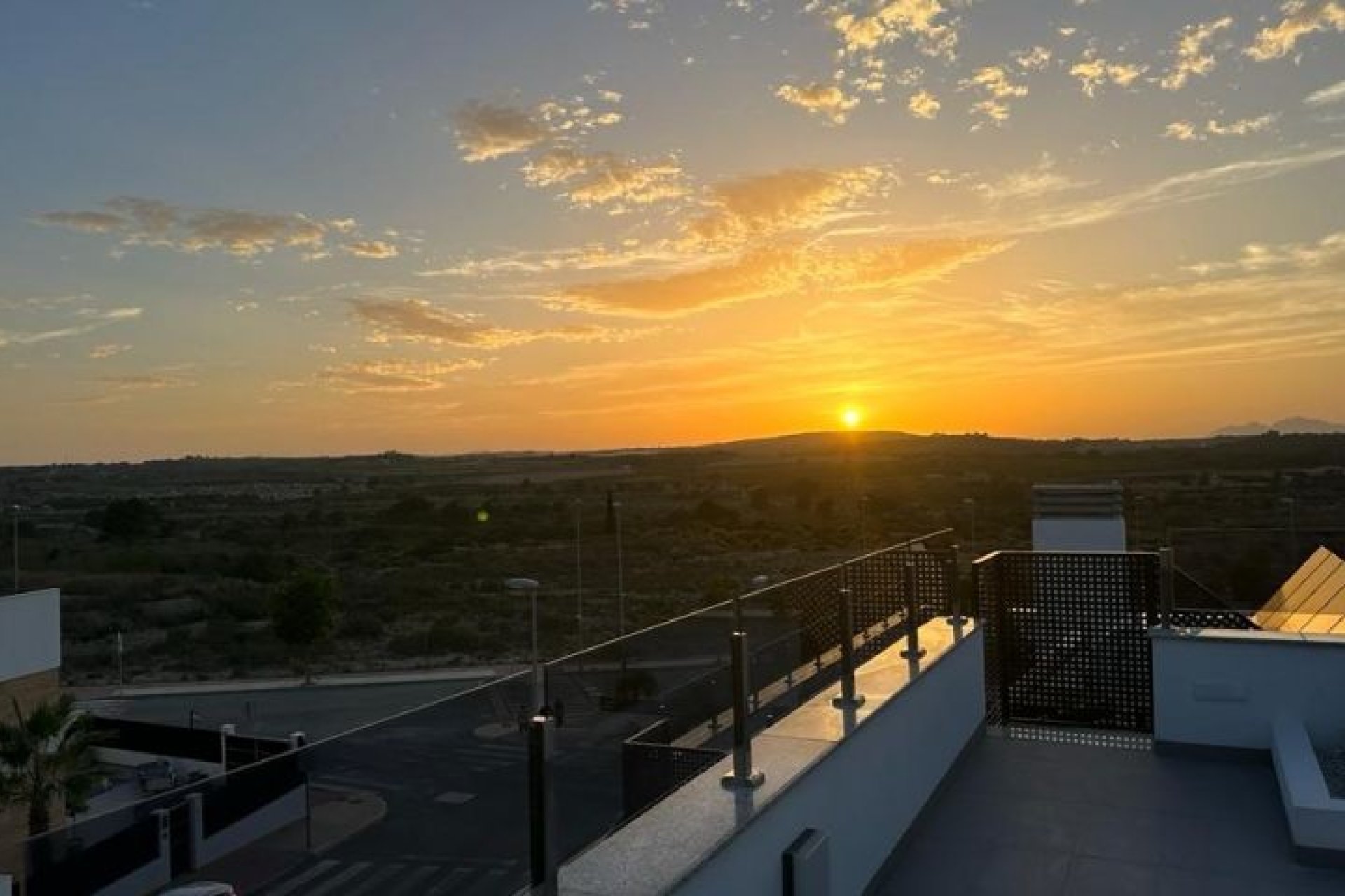 ESPECTACULAR CHALET DISEÑO MODERNO CON PARCELA Y PISCINA A ESTRENAR SITUADA EN LUGAR DE ENSUEÑO EN ESQUINA ORIENTACIÓN SUR. VISTAS PANORÁMICAS Situado en zona residencial tranquila , andando a todo tipo de Servicios como Parada de Bus, Tiendas, Restaurantes,...a 500 m del Ayuntamiento de Benijofar, a 1,2 km del Centro Comercial Benimar y a 3 km de Ciudad Quesada, con todo tipo de Servicios. La vivienda se construyó en 2023. Dispone de 2 Plantas. Planta Baja con Parcela de, Piscina y parte posterior con entrada para coche. Salón amplio con ventanal grande orientado y con acceso directo a Piscina. Cocina de diseño moderno y acceso directo a parte lateral de Parcela. Equipada con todo tipo de instalaciones modernas. Baño completo y dormitorio doble. En Planta Primera dispone de Baño completo y 2 dormitorios dobles, uno de ellos con Terraza amplia soleada. En Planta Superior gran Solarium con Toldo y vistas mediterraneas a zonas rurales y montañas de Crevillente y Orihuela. La vivienda dispone de todos los extras modernos, Toldos eléctricos, aire acondicionado, Placas solares, ...totalmente amueblada y equipada. Muy Buena Inversión. Muy buena rentabilidad.