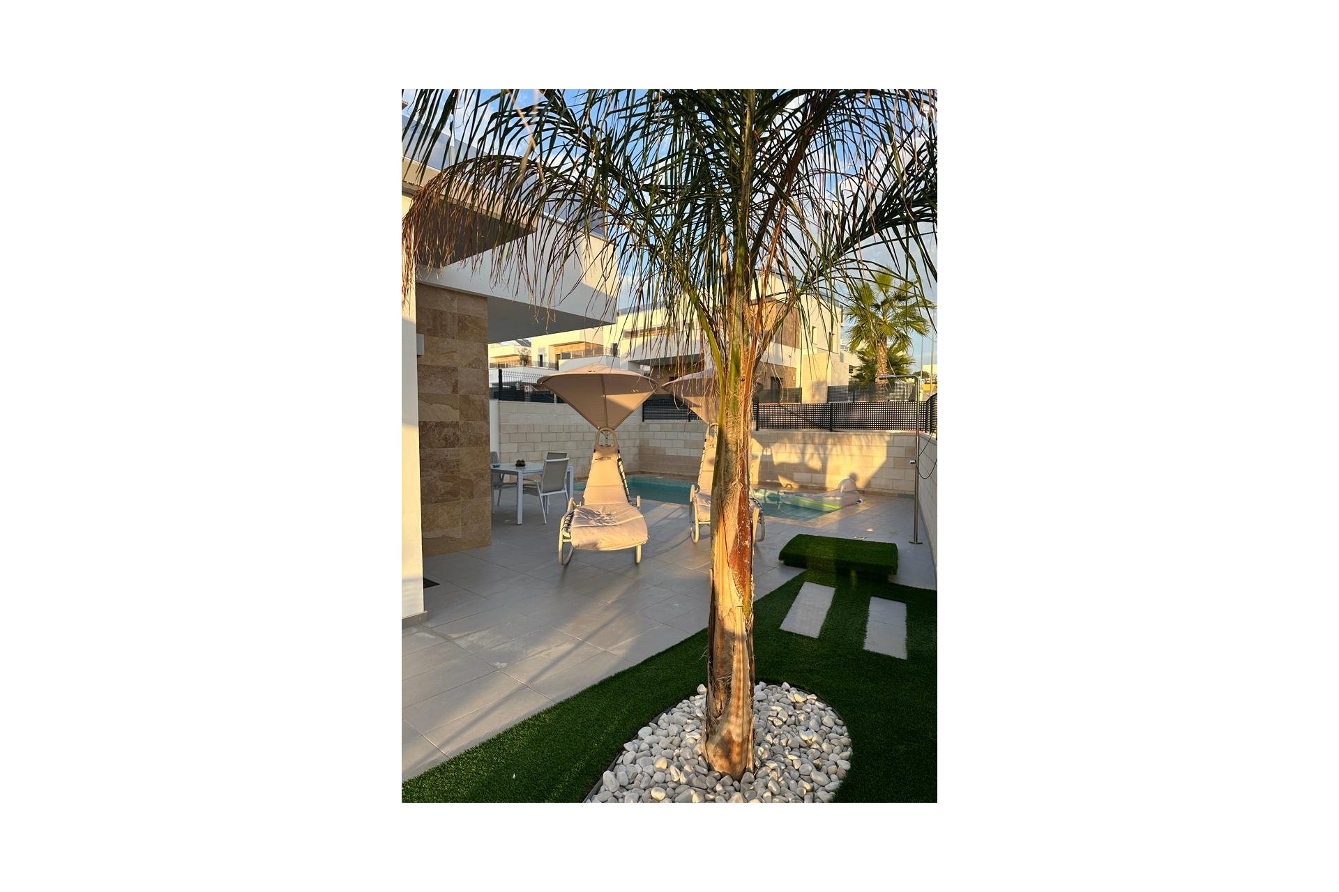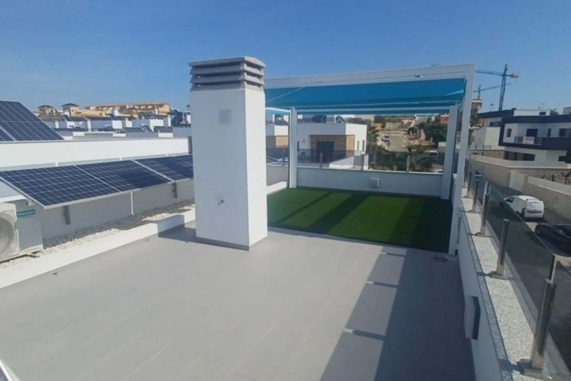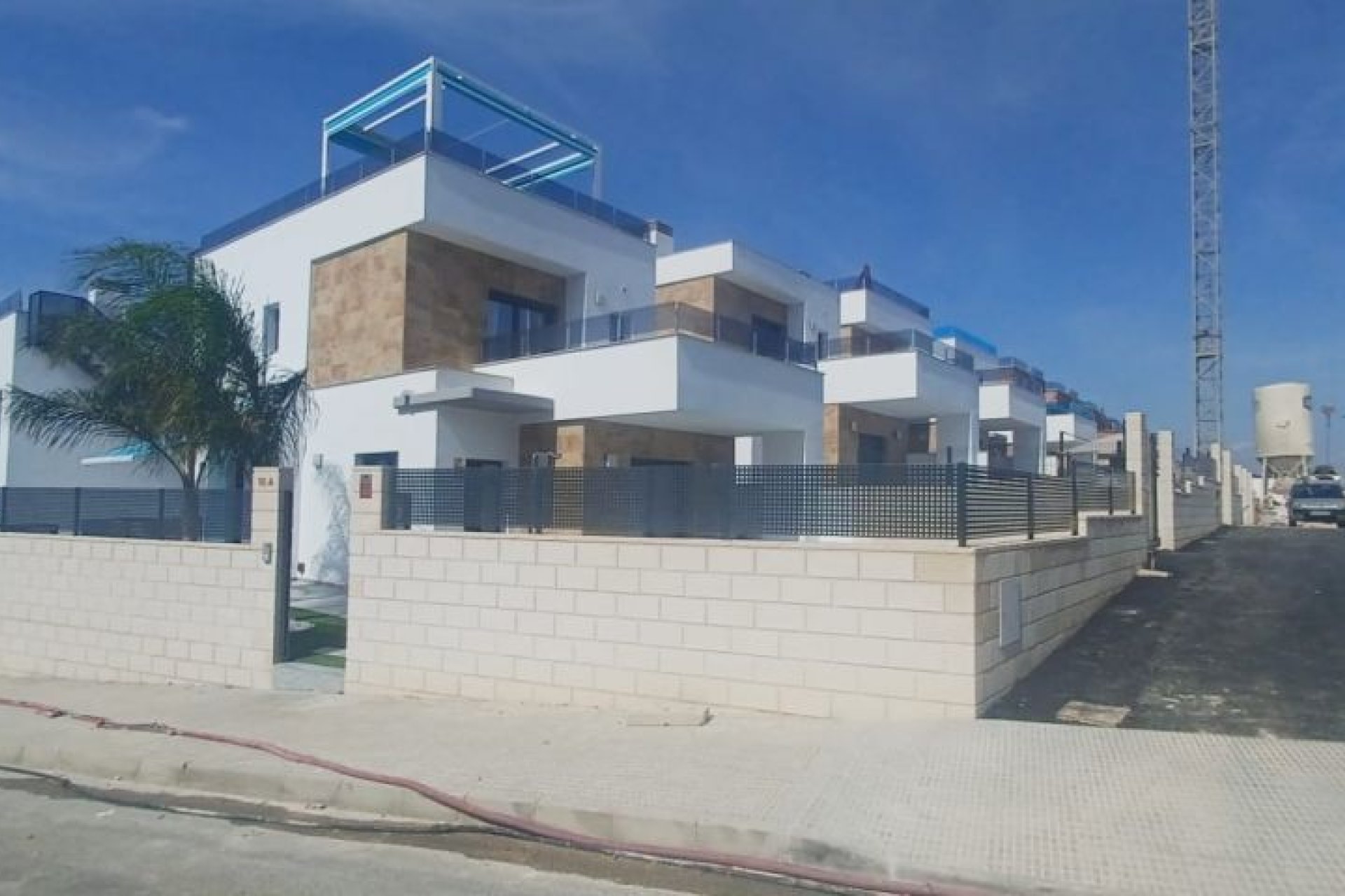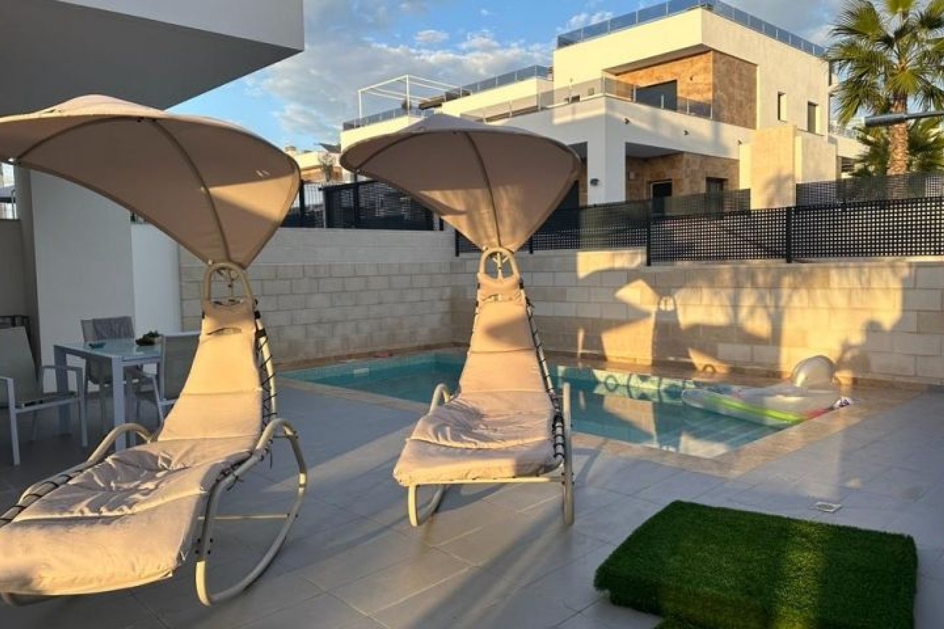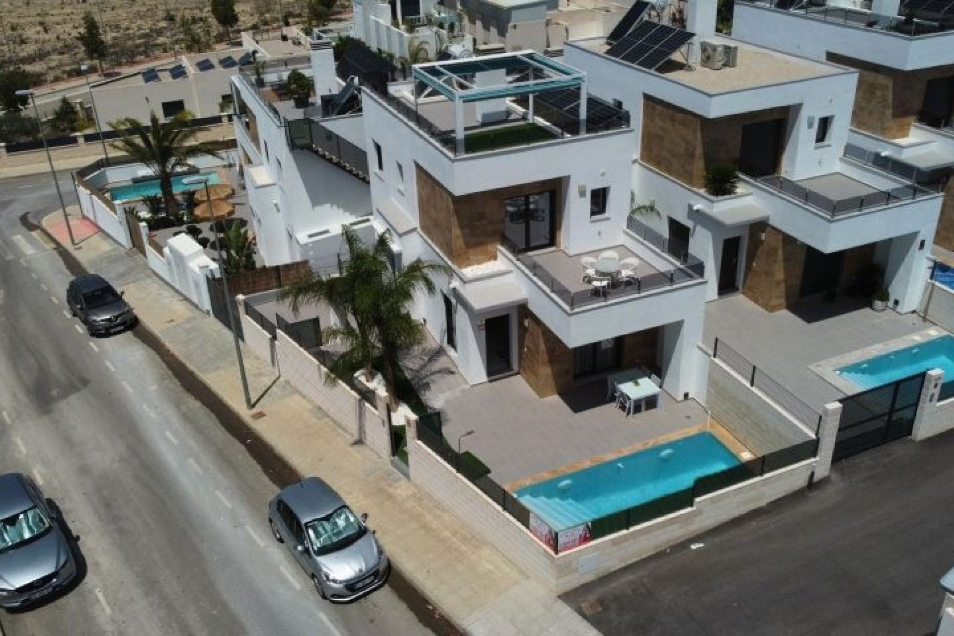 ESPECTACULAR CHALET DISEÑO MODERNO CON PARCELA Y PISCINA A ESTRENAR SITUADA EN LUGAR DE ENSUEÑO EN ESQUINA ORIENTACIÓN SUR. VISTAS PANORÁMICAS Situado en zona residencial tranquila , andando a todo tipo de Servicios como Parada de Bus, Tiendas, Restaurantes,...a 500 m del Ayuntamiento de Benijofar, a 1,2 km del Centro Comercial Benimar y a 3 km de Ciudad Quesada, con todo tipo de Servicios. La vivienda se construyó en 2023. Dispone de 2 Plantas. Planta Baja con Parcela de, Piscina y parte posterior con entrada para coche. Salón amplio con ventanal grande orientado y con acceso directo a Piscina. Cocina de diseño moderno y acceso directo a parte lateral de Parcela. Equipada con todo tipo de instalaciones modernas. Baño completo y dormitorio doble. En Planta Primera dispone de Baño completo y 2 dormitorios dobles, uno de ellos con Terraza amplia soleada. En Planta Superior gran Solarium con Toldo y vistas mediterraneas a zonas rurales y montañas de Crevillente y Orihuela. La vivienda dispone de todos los extras modernos, Toldos eléctricos, aire acondicionado, Placas solares, ...totalmente amueblada y equipada. Muy Buena Inversión. Muy buena rentabilidad.