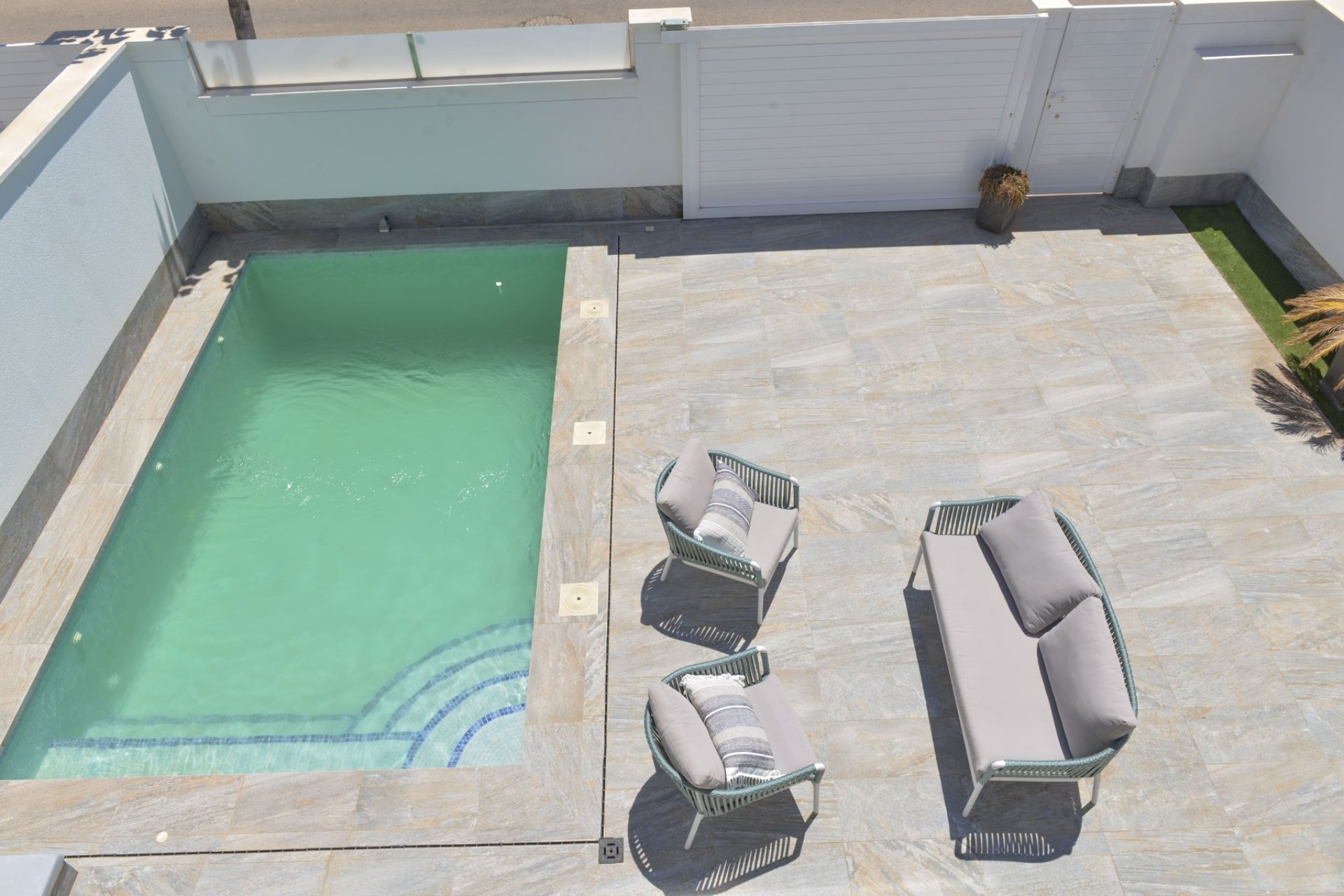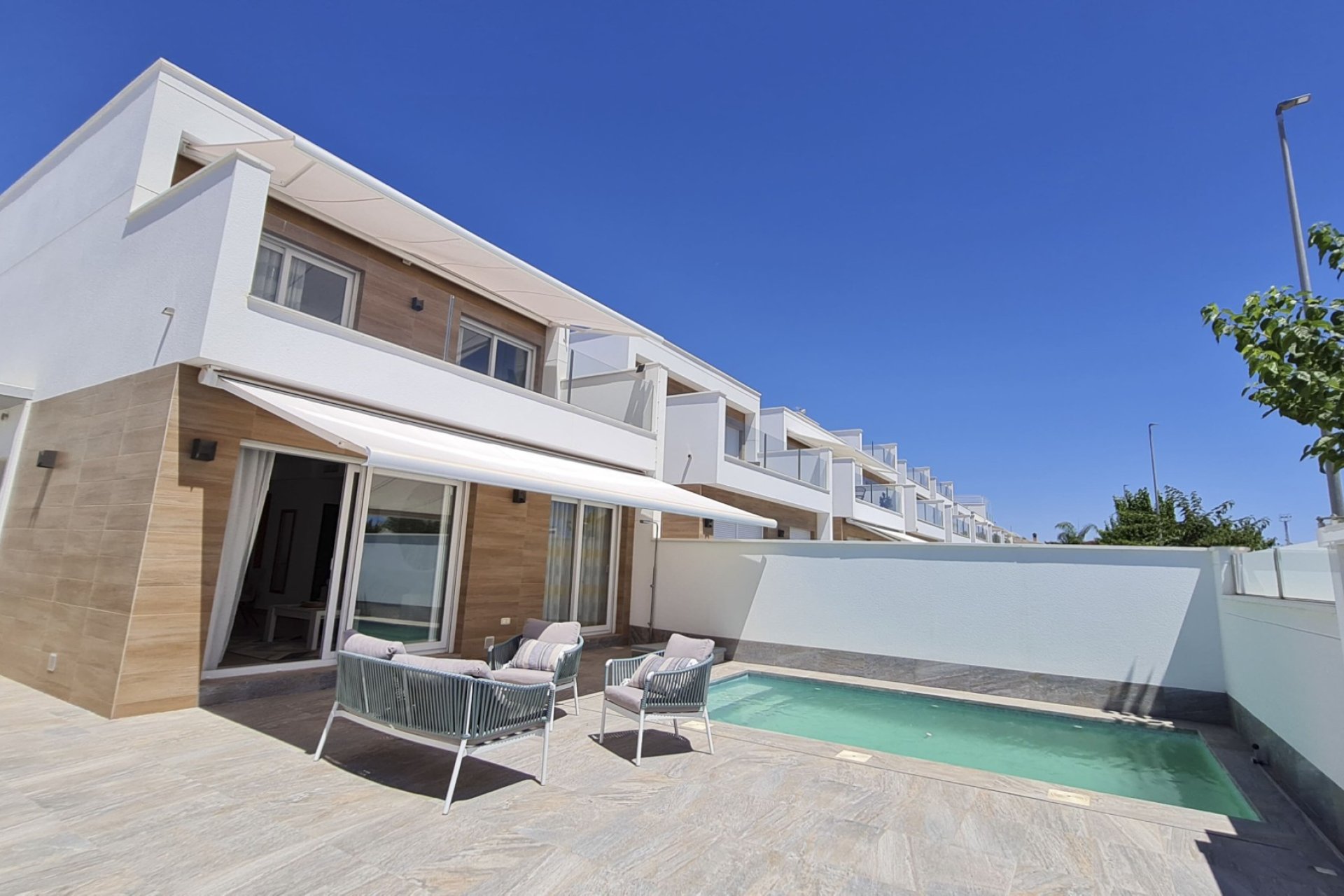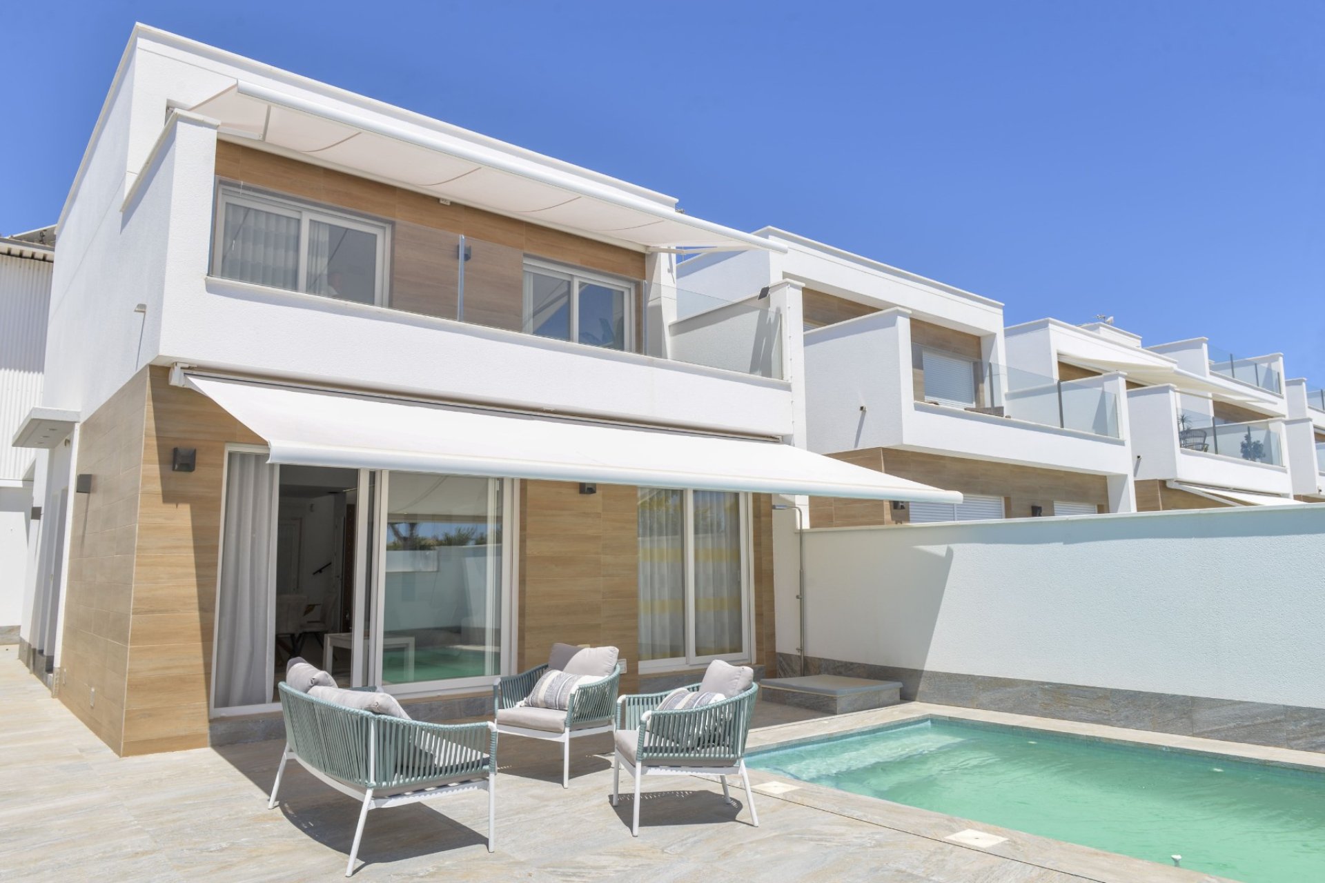 Magnifica villa de 3 dormitorios con armarios empotrados, 2 baños completos, amplia cocina totalmente amueblada y equipada conectada con el salón. Piscina privada de 15 m2, gran jardín, terraza, solarium. Dispone lavadero y trastero en la parte trasera de la vivienda. Parcela 200 m2. Superficie construida 111 m2. 2,5 km de la playa, cerca de los comercios.