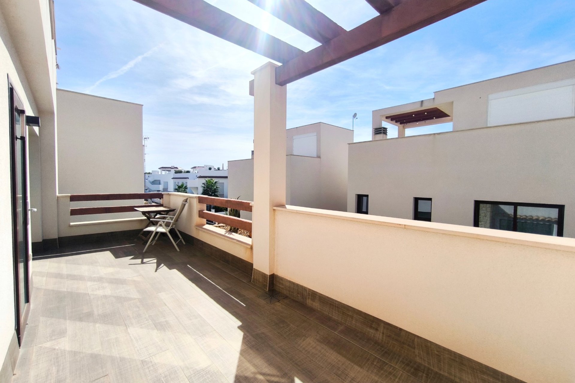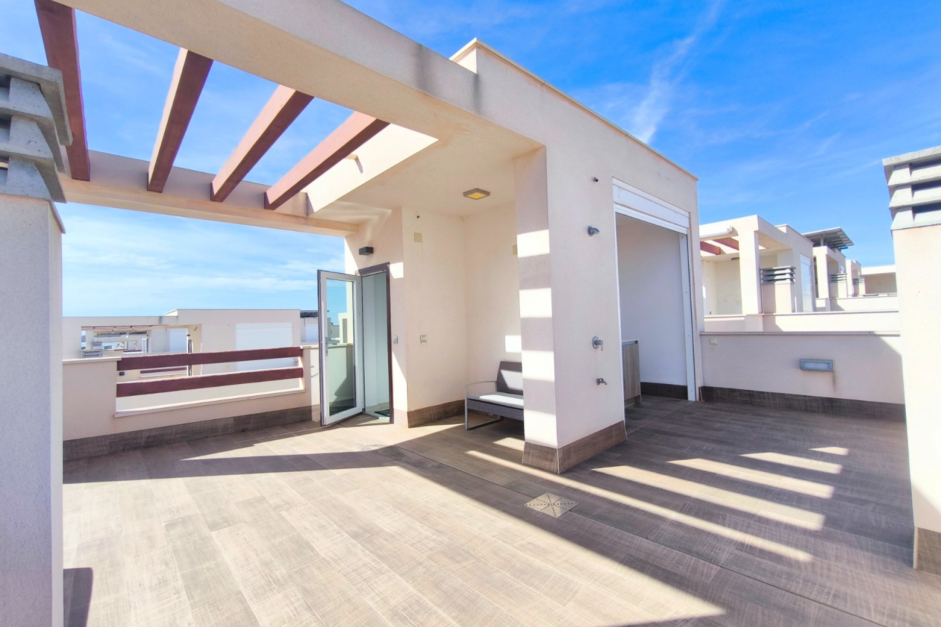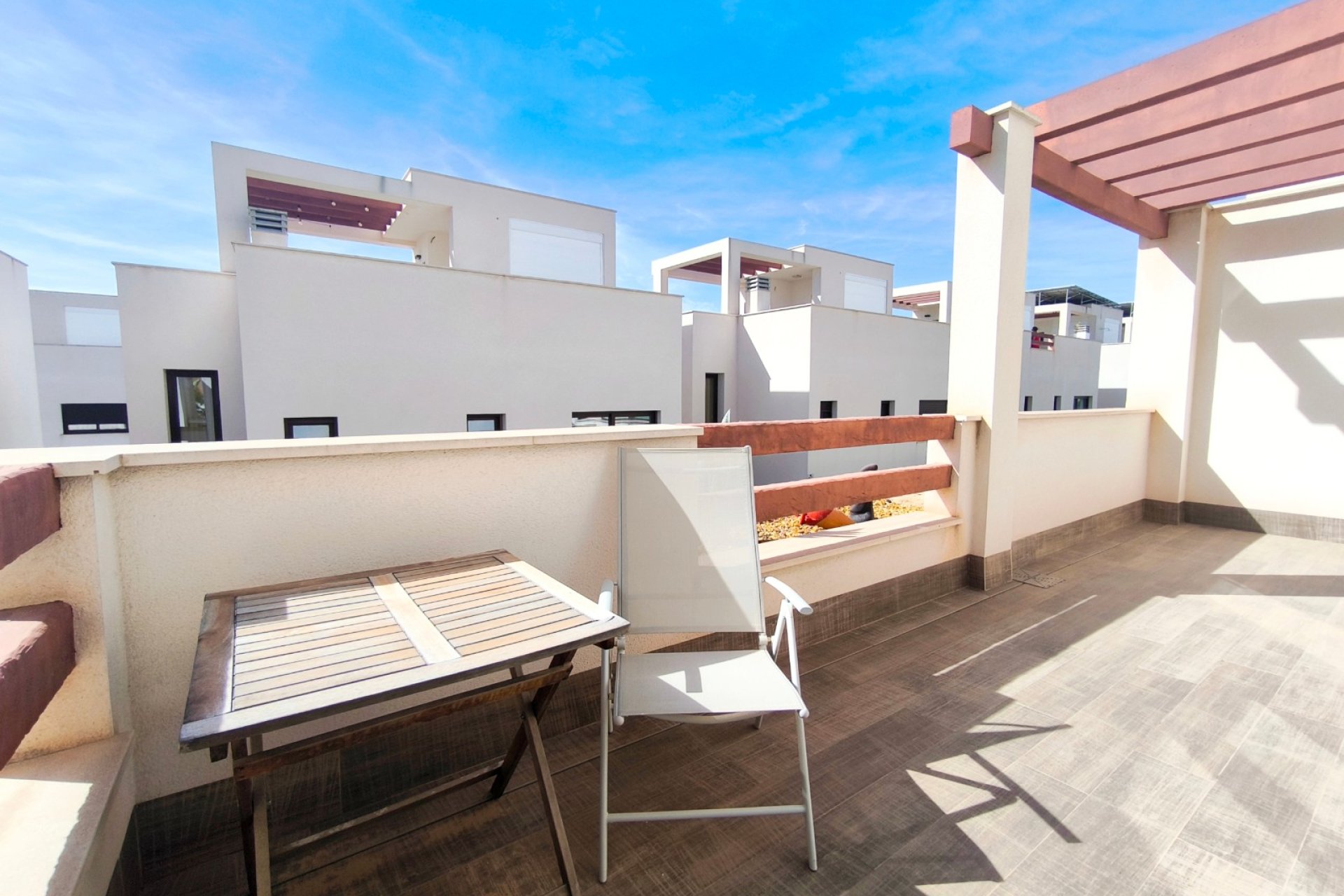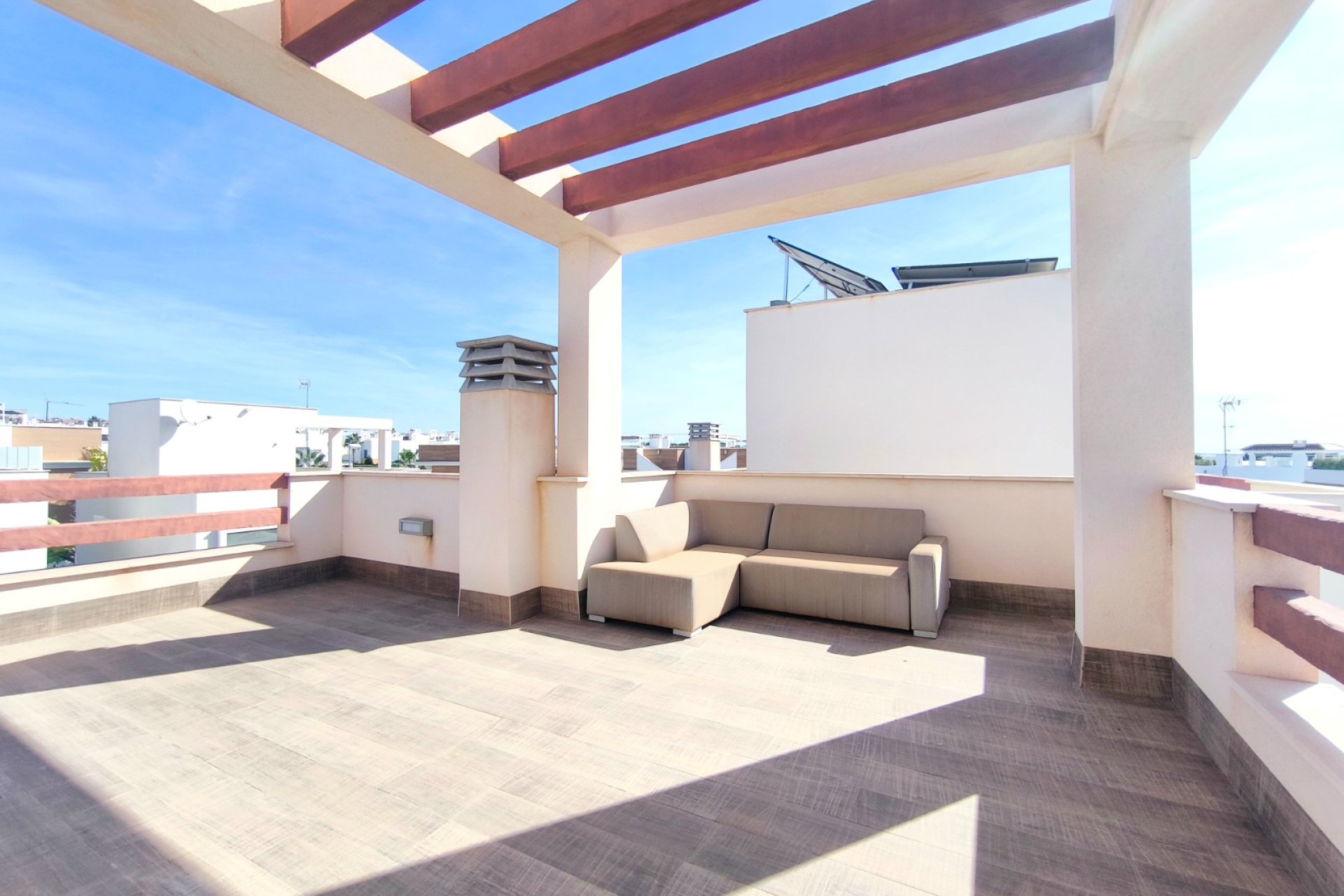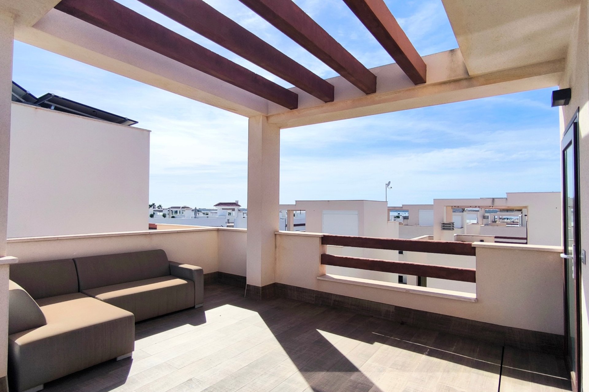 Vivir en Rojales es disfrutar de uno de los entornos más privilegiados de la Costa Blanca. En este acogedor municipio, rodeado de naturaleza, servicios y a solo unos minutos de las playas del Mediterráneo, se encuentra esta villa exclusiva que combina diseño, confort y un estilo de vida único. Su gran atractivo: una piscina privada de agua salada de 3,30 x 6,5 m, perfecta para cuidarse y relajarse en un entorno saludable. Ubicación privilegiada en Rojales La villa está situada en una zona tranquila y residencial de Rojales, muy cerca de la Laguna de La Mata, un paraje natural protegido que destaca por su microclima saludable y beneficioso para el bienestar. A tan solo dos minutos andando encontrarás tiendas de alimentación, locales de ocio y otros comercios que harán tu día a día más cómodo. Además, las playas del Mediterráneo se encuentran a menos de 10 kilómetros, mientras que el campo de golf La Marquesa está muy próximo, ideal para los amantes del deporte al aire libre. Una villa diseñada para tu comodidad Distribución interior Con una superficie construida de 101 m² en una parcela de 182 m², esta villa ofrece amplitud y funcionalidad en cada rincón. Planta baja: un dormitorio, un baño completo, cocina de concepto abierto y un amplio salón comedor muy luminoso. Planta superior: dos dormitorios con baño en suite, perfectamente distribuidos para ofrecer privacidad y confort. Orientación sur: que asegura luz natural durante todo el día. Villa de estilo mediterráneo. La villa se encuentra en un estado excelente, gracias a una decoración en tonos cálidos y neutros. Cada detalle, desde los materiales hasta la elección de los acabados, transmite una sensación de armonía y exclusividad. Espacios exteriores pensados para disfrutar Piscina privada de agua salada La joya de esta propiedad es su piscina privada de 3,30 x 6,5 m con sistema de agua salada. Sus dimensiones permiten disfrutarla tanto para refrescarse como para nadar y pasar inolvidables momentos en familia. El agua salada no solo aporta un baño más natural y agradable, sino que también es buena para la piel, más respetuosa con el cabello y requiere menos productos químicos que una piscina convencional. Un valor añadido que convierte esta villa en un verdadero oasis de bienestar. Además, existe la posibilidad de instalar un jacuzzi junto a la piscina, creando un espacio de relax con un toque exclusivo. Solárium con torreón moderno Un elegante torreón moderno da acceso al solárium privado, un espacio único para tomar el sol, relajarse o disfrutar de las tardes mediterráneas con vistas despejadas. Terraza y porche privado En la entrada, una terraza abierta con pequeño porche ofrece espacio suficiente para estacionar un vehículo. Todo ello dentro de un residencial cerrado, que aporta seguridad y tranquilidad. El hogar perfecto en la Costa Blanca Esta villa en Rojales lo tiene todo: diseño moderno, ubicación estratégica, un entorno saludable junto a la Laguna de La Mata y, como protagonista, una piscina privada de agua salada de 3,30 x 6,5 m que marca la diferencia. Una oportunidad única para quienes buscan un hogar donde vivir todo el año, disfrutar de largas estancias o tener un refugio de relax en la Costa Blanca. ¿Quieres conocer más detalles o programar una visita a esta villa en Rojales? Contáctanos hoy mismo y descubre tu nuevo hogar con piscina privada de agua salada.
