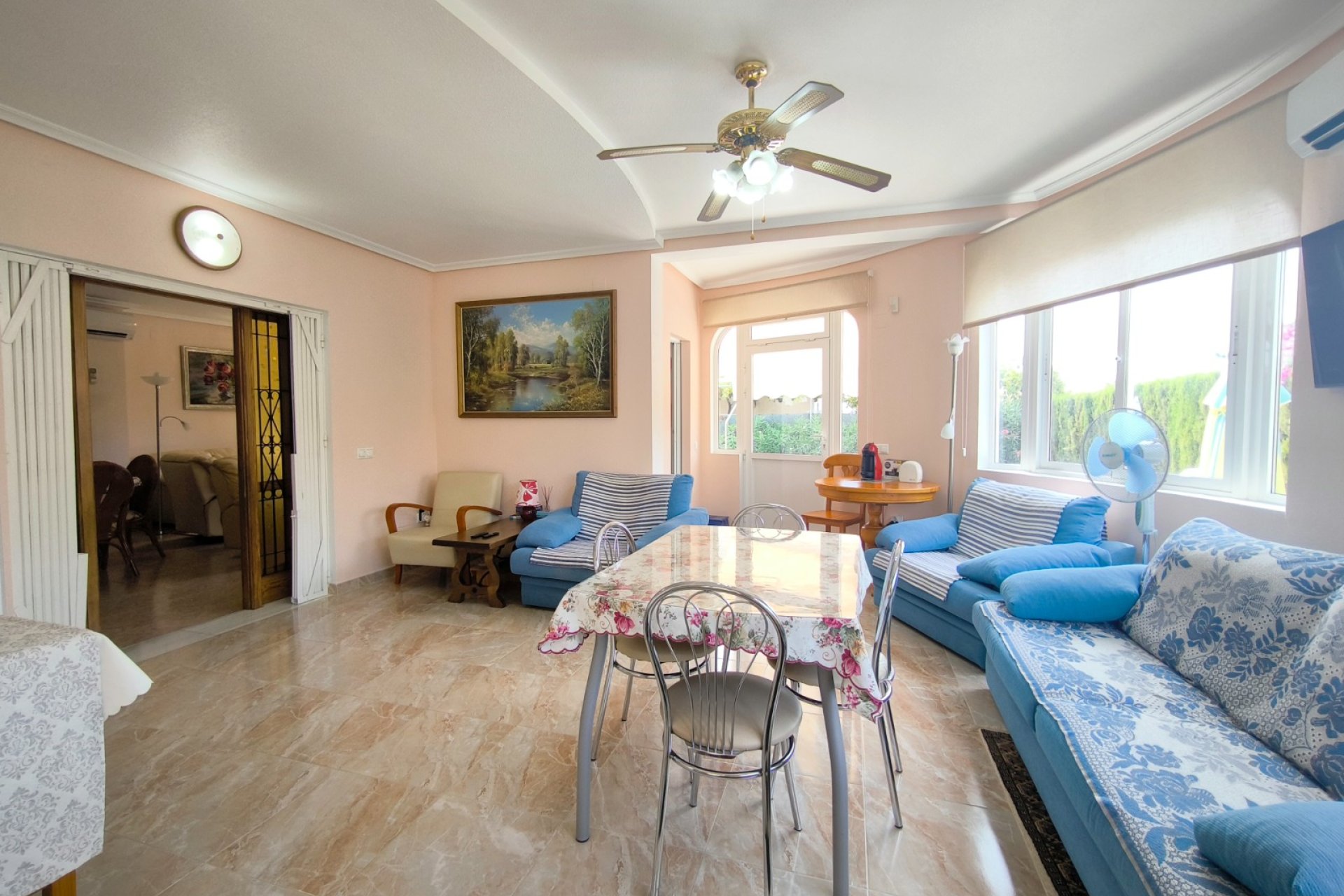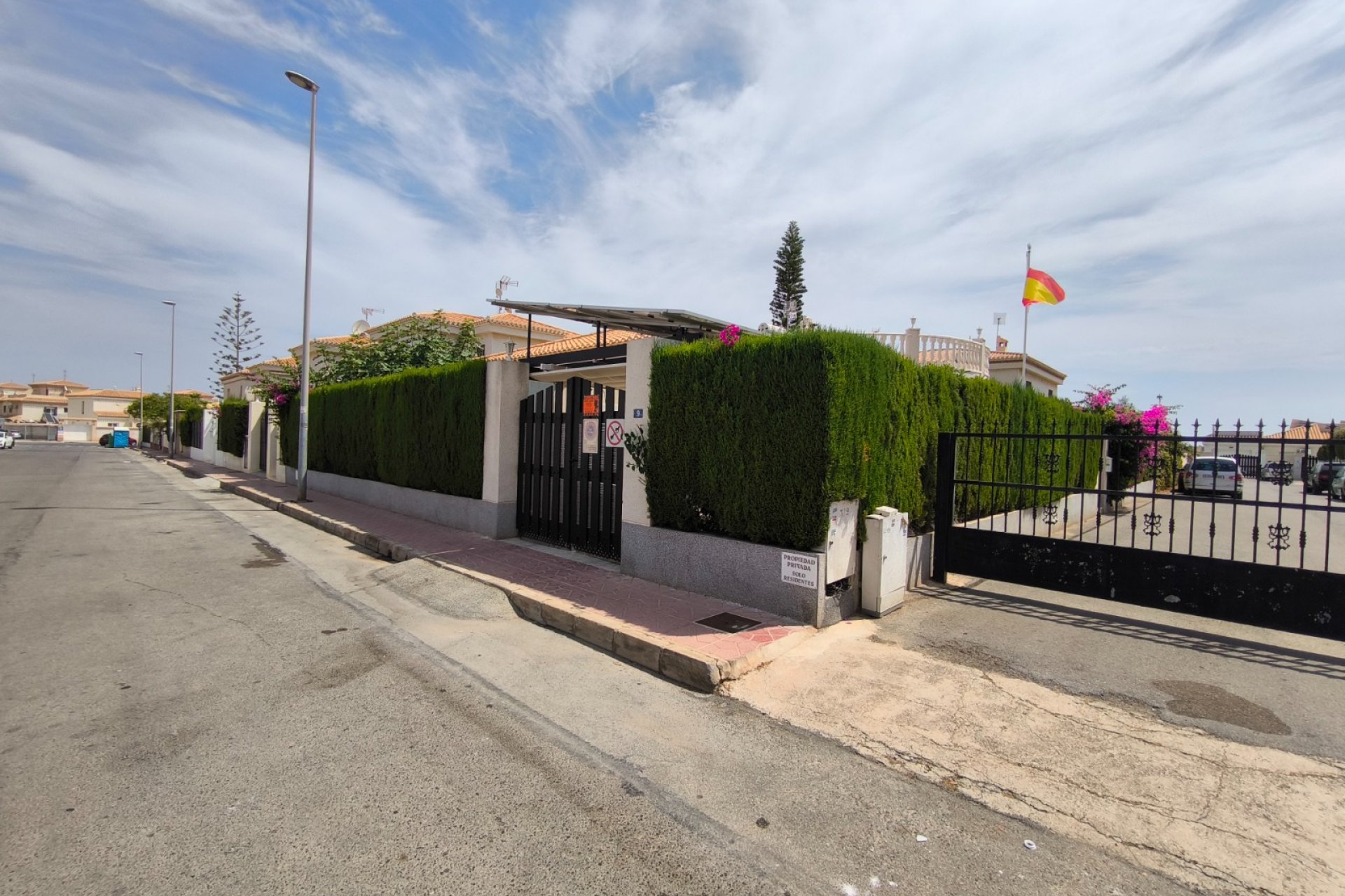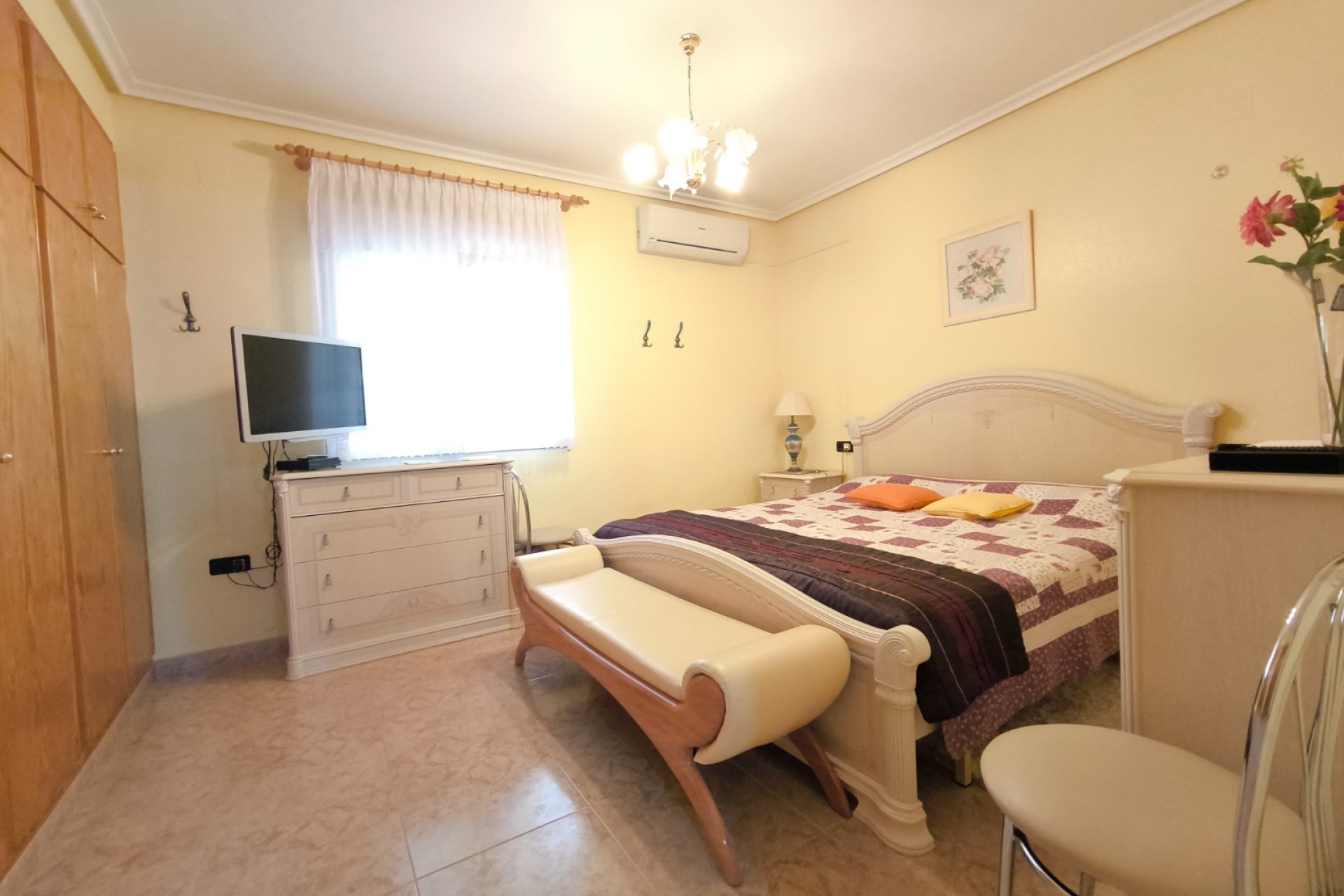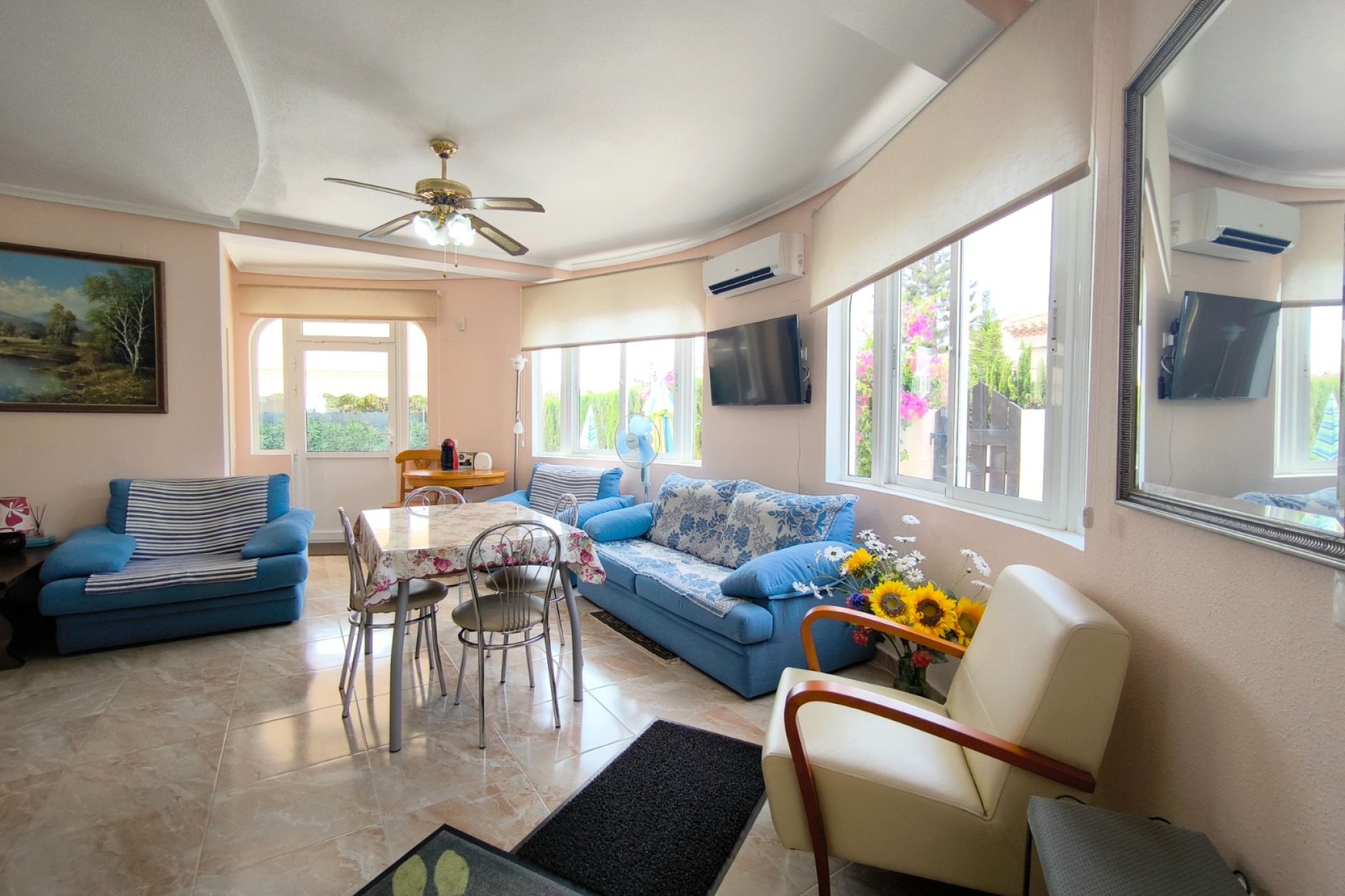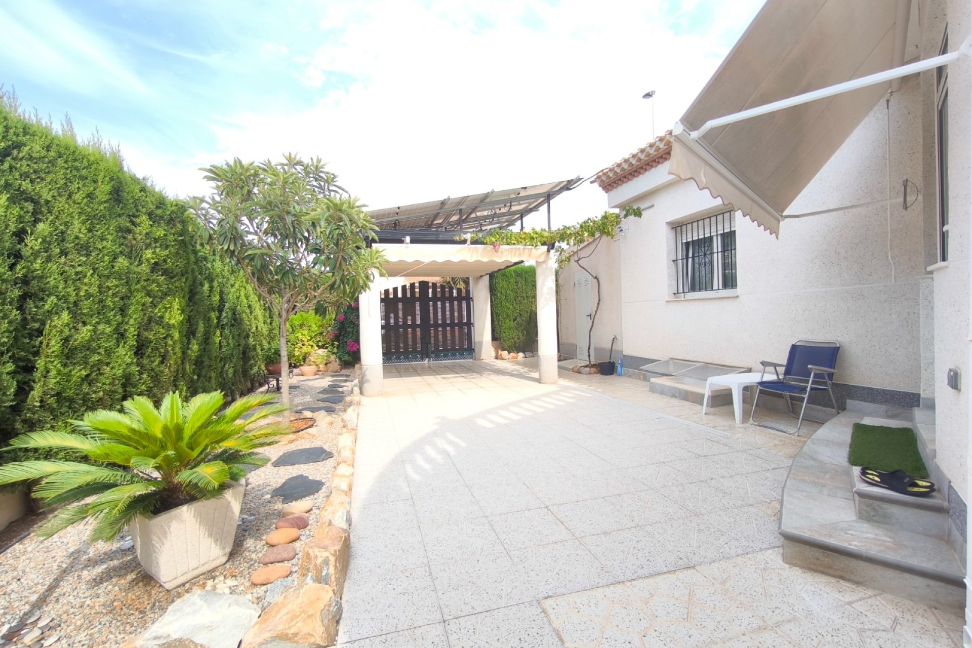 Ocasión única: a la venta Villa de una sola planta de 150 metros cuadrados, ubicada en la mejor zona de la ciudad y completamente amueblada. Dispone de 3 dormitorios y 2 baños, uno de ellos en suite, un salón comedor luminoso y de gran amplitud para no tener problemas de espacio, cocina independiente, galería, terraza acristalada transformada como un salón de invierno, un pequeño vestidor y Solarium. La chimenea en el salón comedor proporciona un punto de encuentro familiar y ofrece esa sensación de hogar que buscas. Aire acondicionado en cada dormitorio así como en el salón y en la terraza acristalada, consiguiendo así el efecto deseado en cada unos de las cinco dependencias. Suelo radiante por electricidad en toda la planta (excepto en la terraza acristalada) con un mando independiente en cada habitación/baño para sacar el máximo provecho de su funcionalidad. Gracias a sus paneles solares de 10kWh, el gasto de electricidad se reduce a un máximo de 10 euros al mes aunando así la energía sostenible con un gran ahorro económico sin perder comodidad. Ademas hay una instalacion de gas. Cuenta además con 2 trasteros con acceso desde el jardín, con mucho espacio extra para almacenaje y facilidad de colocación de armarios de fácil acceso: sótano 25 m2. Piscina climatizada 4x8, recién reformado. Alrededor de 47 m3. Con vistas al mar. Jardín con arboles frutales y sistema de auto-riego, con mucho espacio para que disfrutes de su parcela de 500 metros cuadrados. Zona de Playa Flamenca al lado del mercadillo que se celebra cada sábado y que te permitirá disfrutar del dinamismo de esta área de la localidad.