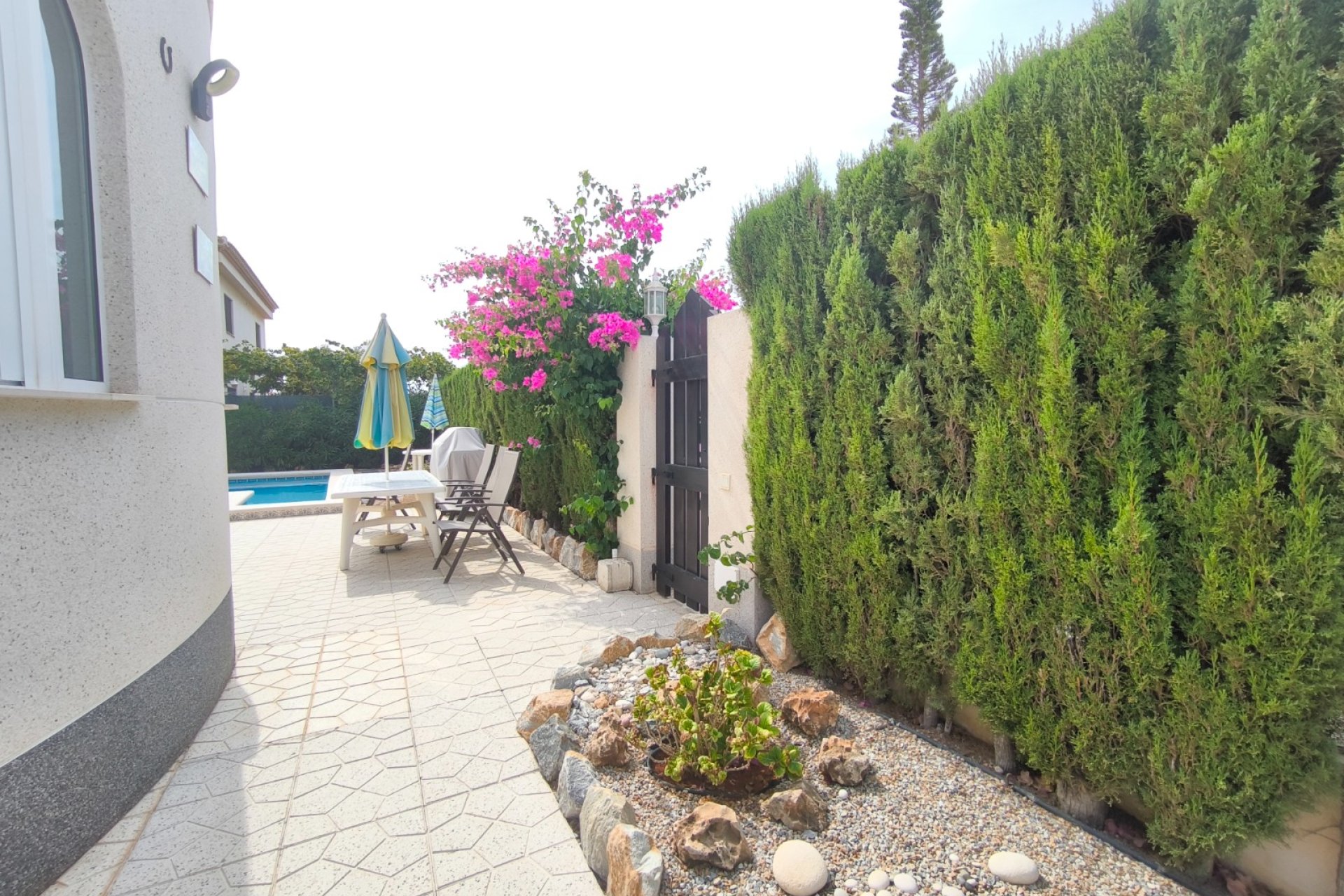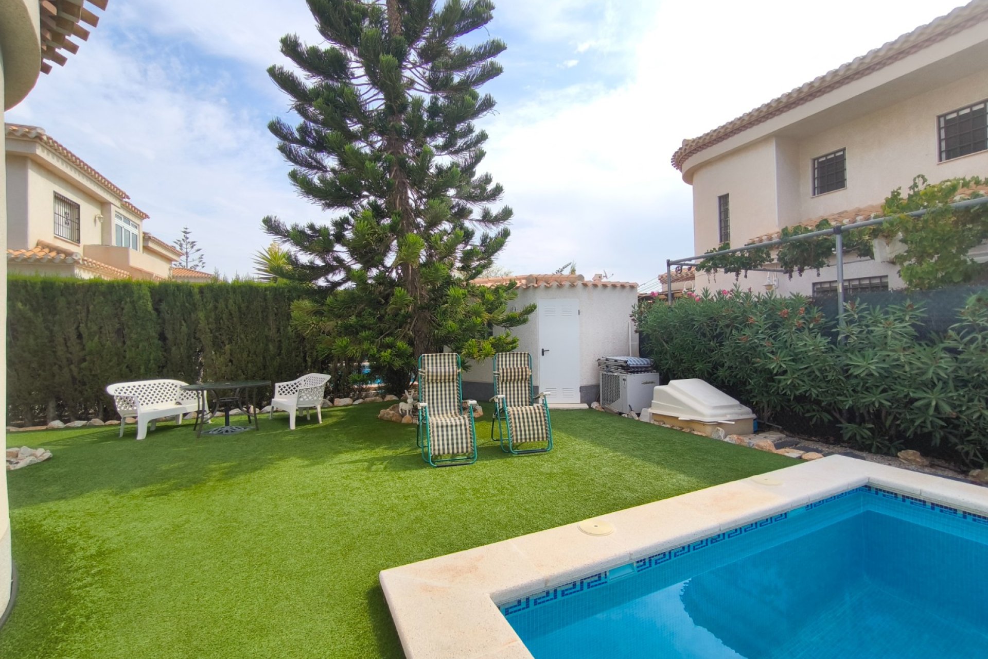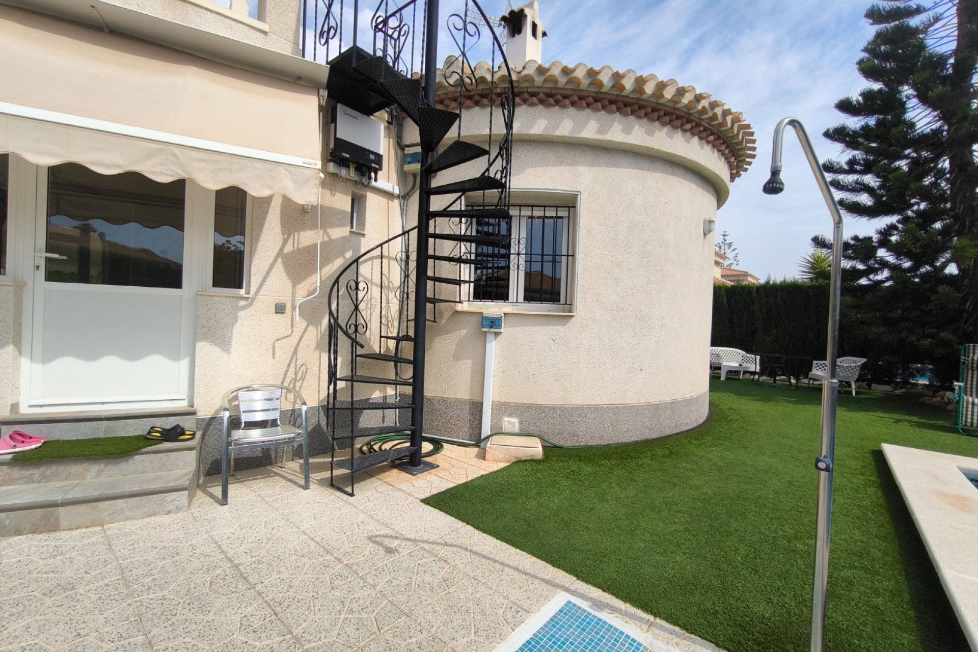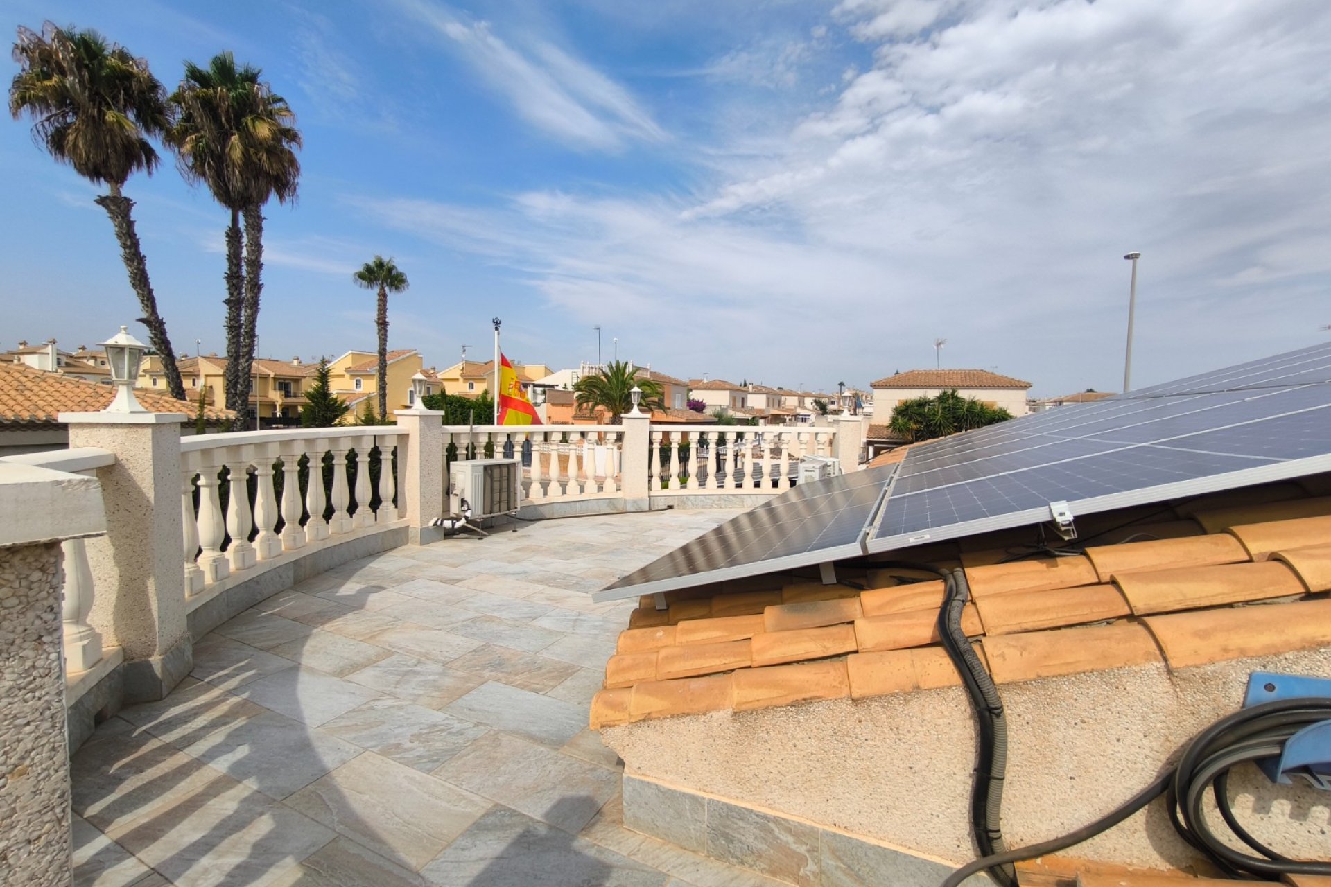 Ocasión única: a la venta Villa de una sola planta de 150 metros cuadrados, ubicada en la mejor zona de la ciudad y completamente amueblada. Dispone de 3 dormitorios y 2 baños, uno de ellos en suite, un salón comedor luminoso y de gran amplitud para no tener problemas de espacio, cocina independiente, galería, terraza acristalada transformada como un salón de invierno, un pequeño vestidor y Solarium. La chimenea en el salón comedor proporciona un punto de encuentro familiar y ofrece esa sensación de hogar que buscas. Aire acondicionado en cada dormitorio así como en el salón y en la terraza acristalada, consiguiendo así el efecto deseado en cada unos de las cinco dependencias. Suelo radiante por electricidad en toda la planta (excepto en la terraza acristalada) con un mando independiente en cada habitación/baño para sacar el máximo provecho de su funcionalidad. Gracias a sus paneles solares de 10kWh, el gasto de electricidad se reduce a un máximo de 10 euros al mes aunando así la energía sostenible con un gran ahorro económico sin perder comodidad. Ademas hay una instalacion de gas. Cuenta además con 2 trasteros con acceso desde el jardín, con mucho espacio extra para almacenaje y facilidad de colocación de armarios de fácil acceso: sótano 25 m2. Piscina climatizada 4x8, recién reformado. Alrededor de 47 m3. Con vistas al mar. Jardín con arboles frutales y sistema de auto-riego, con mucho espacio para que disfrutes de su parcela de 500 metros cuadrados. Zona de Playa Flamenca al lado del mercadillo que se celebra cada sábado y que te permitirá disfrutar del dinamismo de esta área de la localidad.