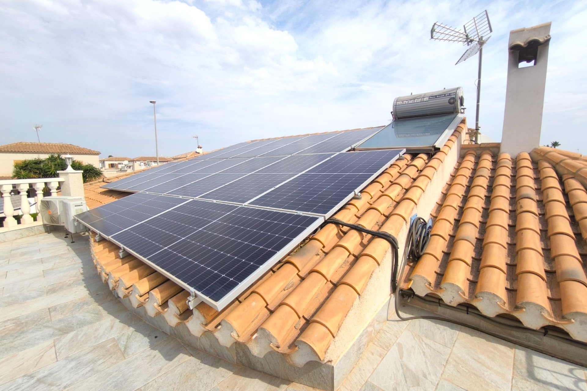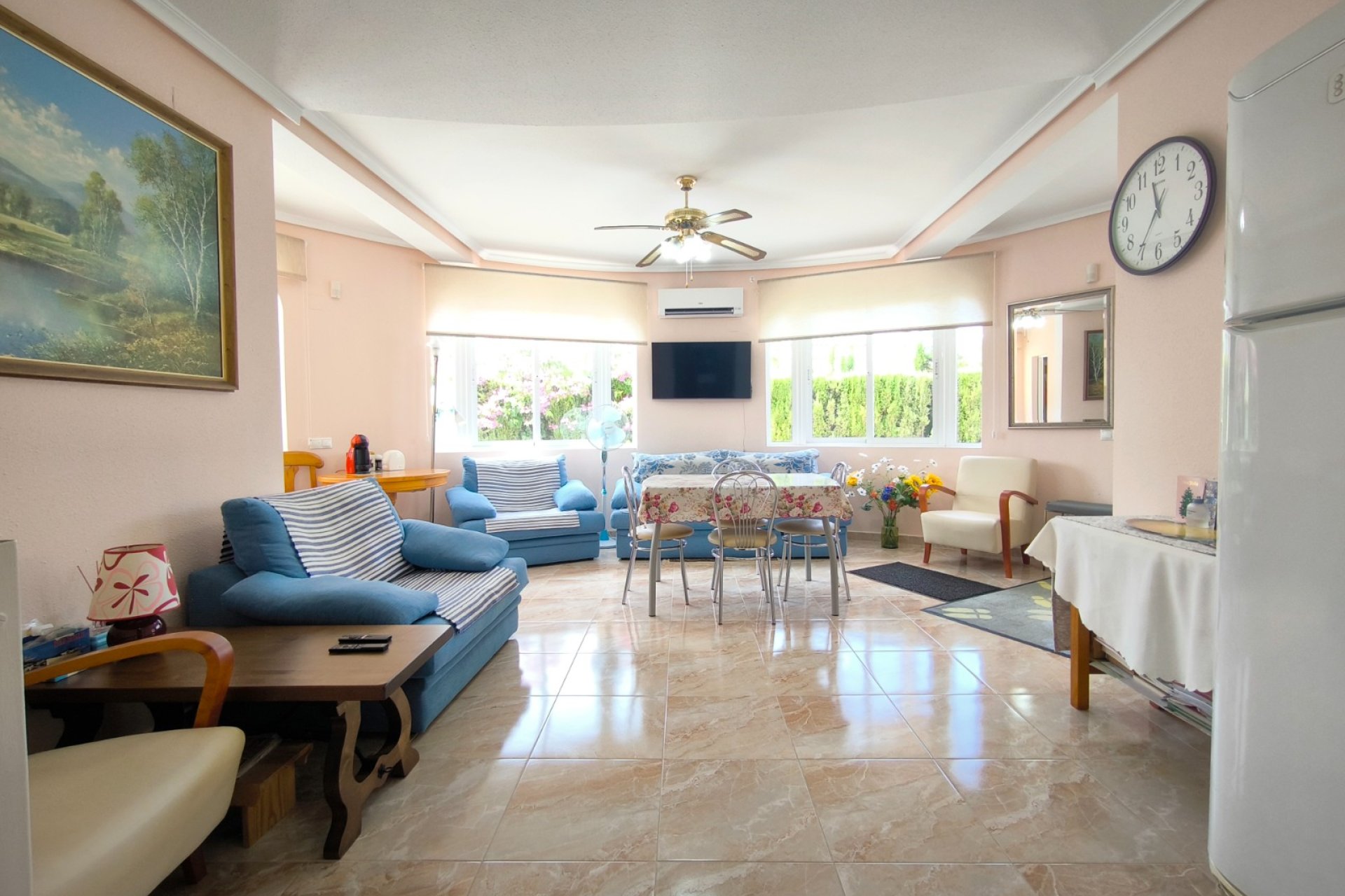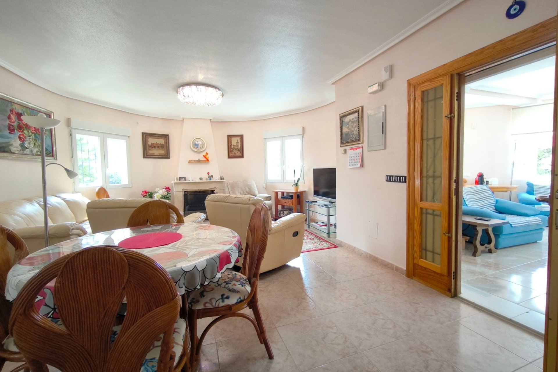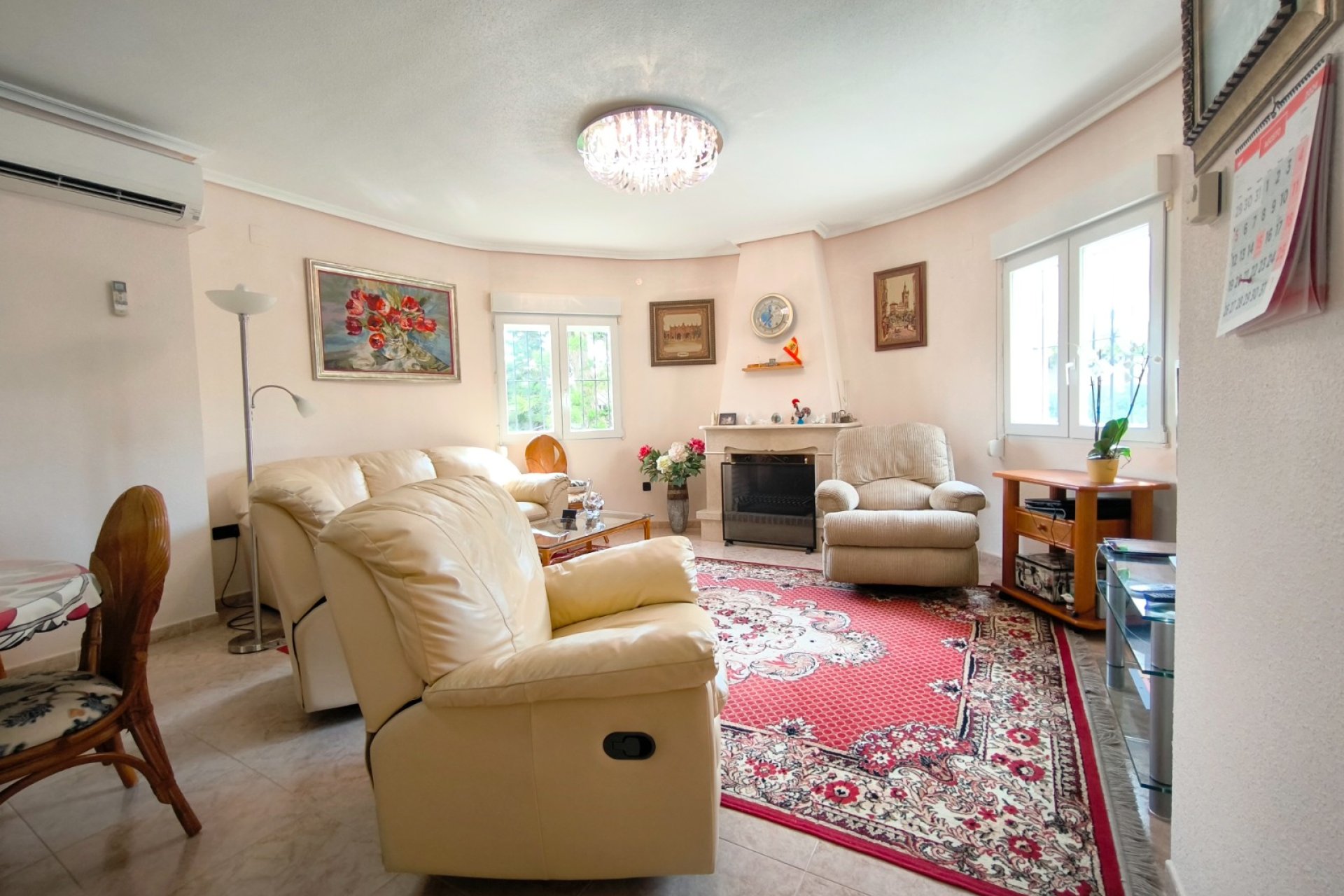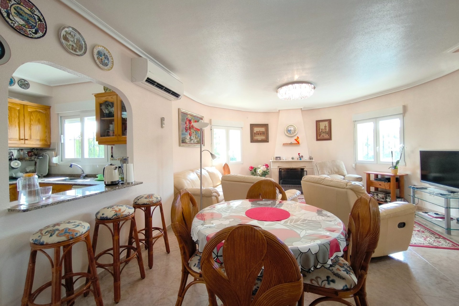 Ocasión única: a la venta Villa de una sola planta de 150 metros cuadrados, ubicada en la mejor zona de la ciudad y completamente amueblada. Dispone de 3 dormitorios y 2 baños, uno de ellos en suite, un salón comedor luminoso y de gran amplitud para no tener problemas de espacio, cocina independiente, galería, terraza acristalada transformada como un salón de invierno, un pequeño vestidor y Solarium. La chimenea en el salón comedor proporciona un punto de encuentro familiar y ofrece esa sensación de hogar que buscas. Aire acondicionado en cada dormitorio así como en el salón y en la terraza acristalada, consiguiendo así el efecto deseado en cada unos de las cinco dependencias. Suelo radiante por electricidad en toda la planta (excepto en la terraza acristalada) con un mando independiente en cada habitación/baño para sacar el máximo provecho de su funcionalidad. Gracias a sus paneles solares de 10kWh, el gasto de electricidad se reduce a un máximo de 10 euros al mes aunando así la energía sostenible con un gran ahorro económico sin perder comodidad. Ademas hay una instalacion de gas. Cuenta además con 2 trasteros con acceso desde el jardín, con mucho espacio extra para almacenaje y facilidad de colocación de armarios de fácil acceso: sótano 25 m2. Piscina climatizada 4x8, recién reformado. Alrededor de 47 m3. Con vistas al mar. Jardín con arboles frutales y sistema de auto-riego, con mucho espacio para que disfrutes de su parcela de 500 metros cuadrados. Zona de Playa Flamenca al lado del mercadillo que se celebra cada sábado y que te permitirá disfrutar del dinamismo de esta área de la localidad.