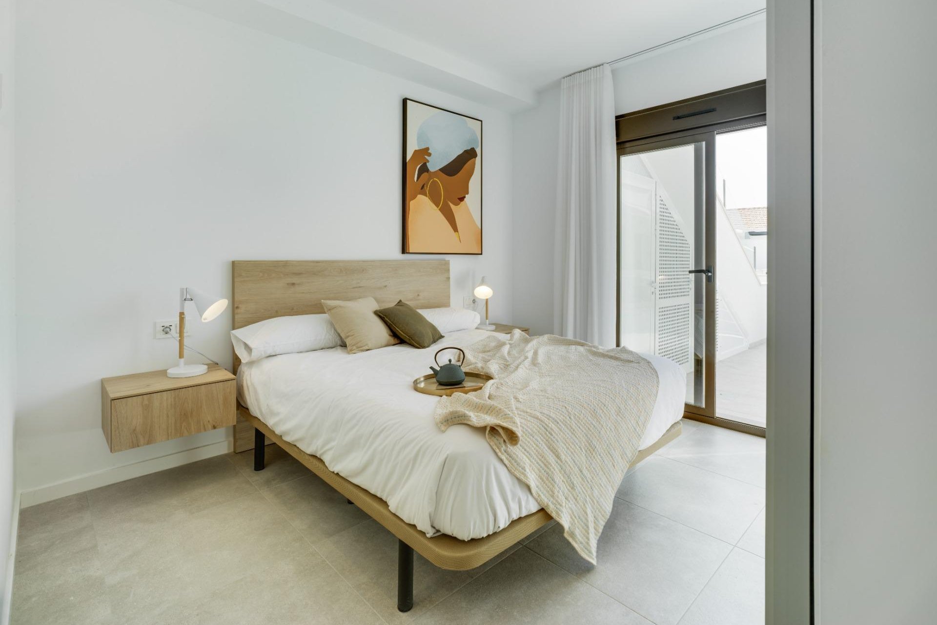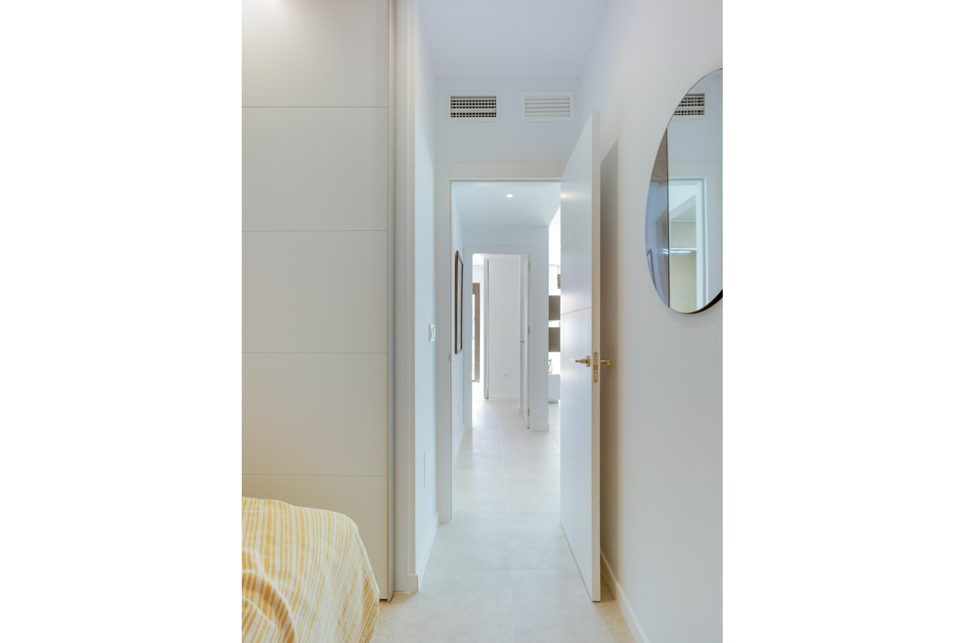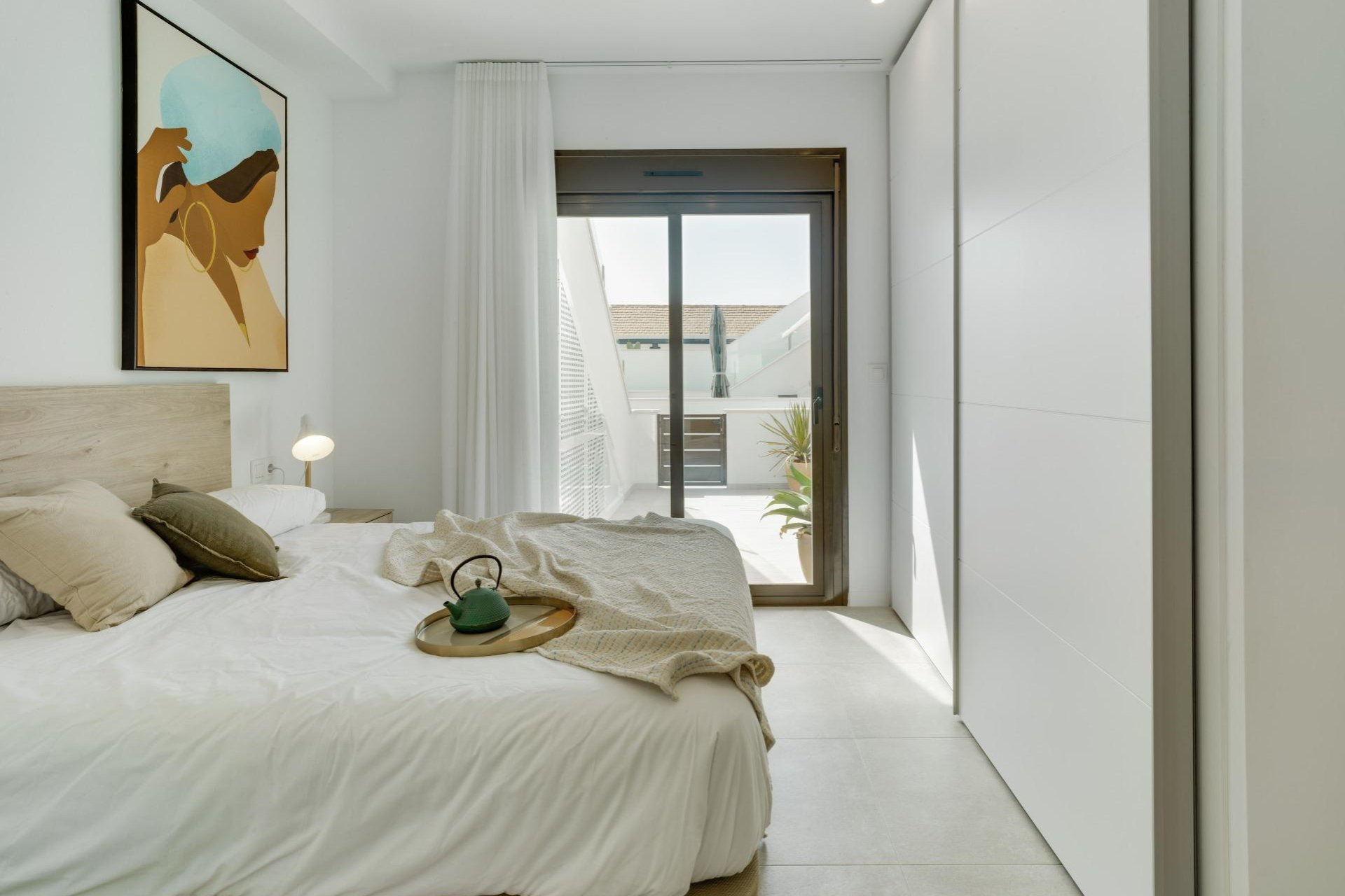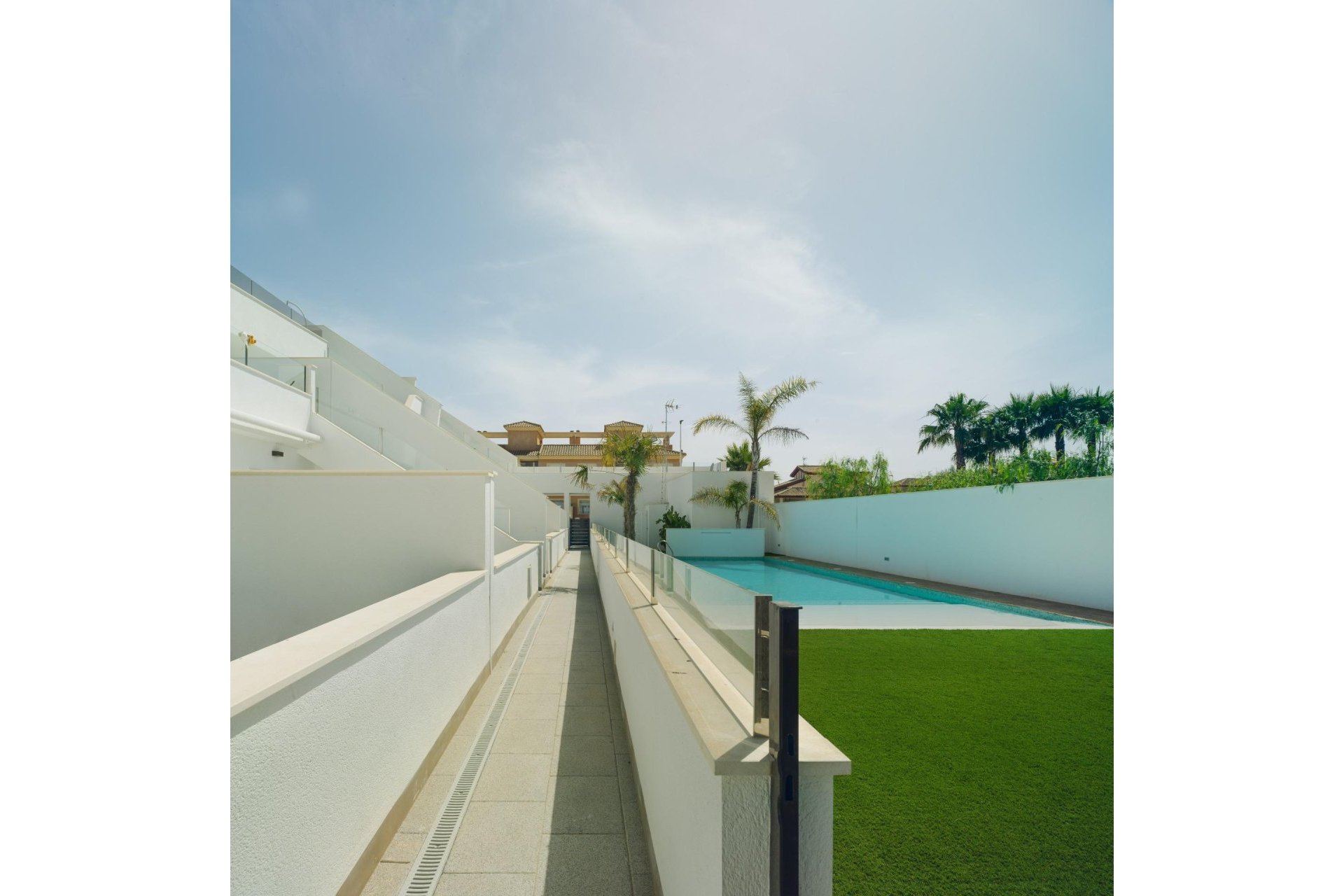 RESIDENCIAL DE OBRA NUEVA DE BUNGALOWS EN PILAR DE LA HORADADA Exclusivo residencial de obra nueva de 16 modernos bungalows en Pilar de la Horadada. Puede elegir bungalows de 2 ó 3 dormitorios con 2 baños. Las unidades de planta baja tienen grandes terrazas delanteras y traseras y acceso directo a la piscina comunitaria y jardín, las propiedades de la planta superior tienen un solarium muy grande en la azotea. El espacio habitable consta de un gran salón / comedor y cocina totalmente equipada con grandes puertas correderas que incorporan el espacio exterior. Los dormitorios tienen armarios empotrados. Los baños con calefacción por suelo radiante. Instalación de aire acondicionado. Todas las viviendas disponen de plaza de aparcamiento privada. Pilar de la Horadada es un típico pueblo español en la parte más meridional de la Costa Blanca. La gran calle principal tiene supermercados, muchas tiendas, restaurantes y bares y algunas plazas encantadoras. Las hermosas playas de Torre de la Horadada y Mil Palmeras con paseo marítimo de arena fina está a sólo 5 minutos. Los aeropuertos de Corvera (Murcia) y Alicante están respectivamente a 40 y 55 minutos.