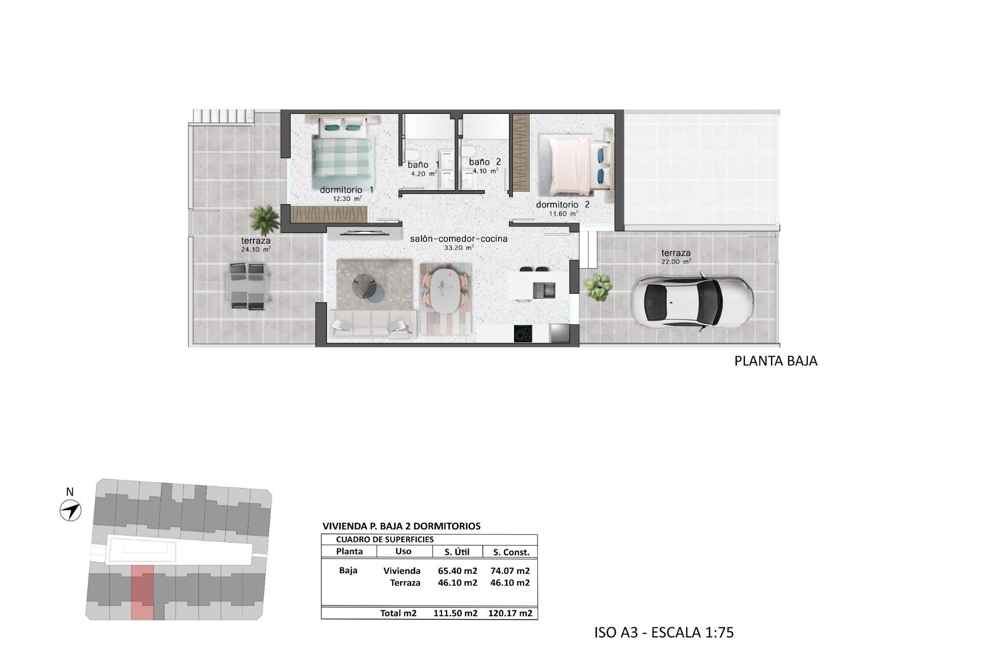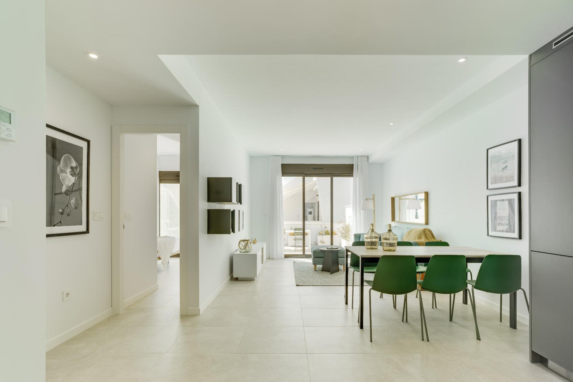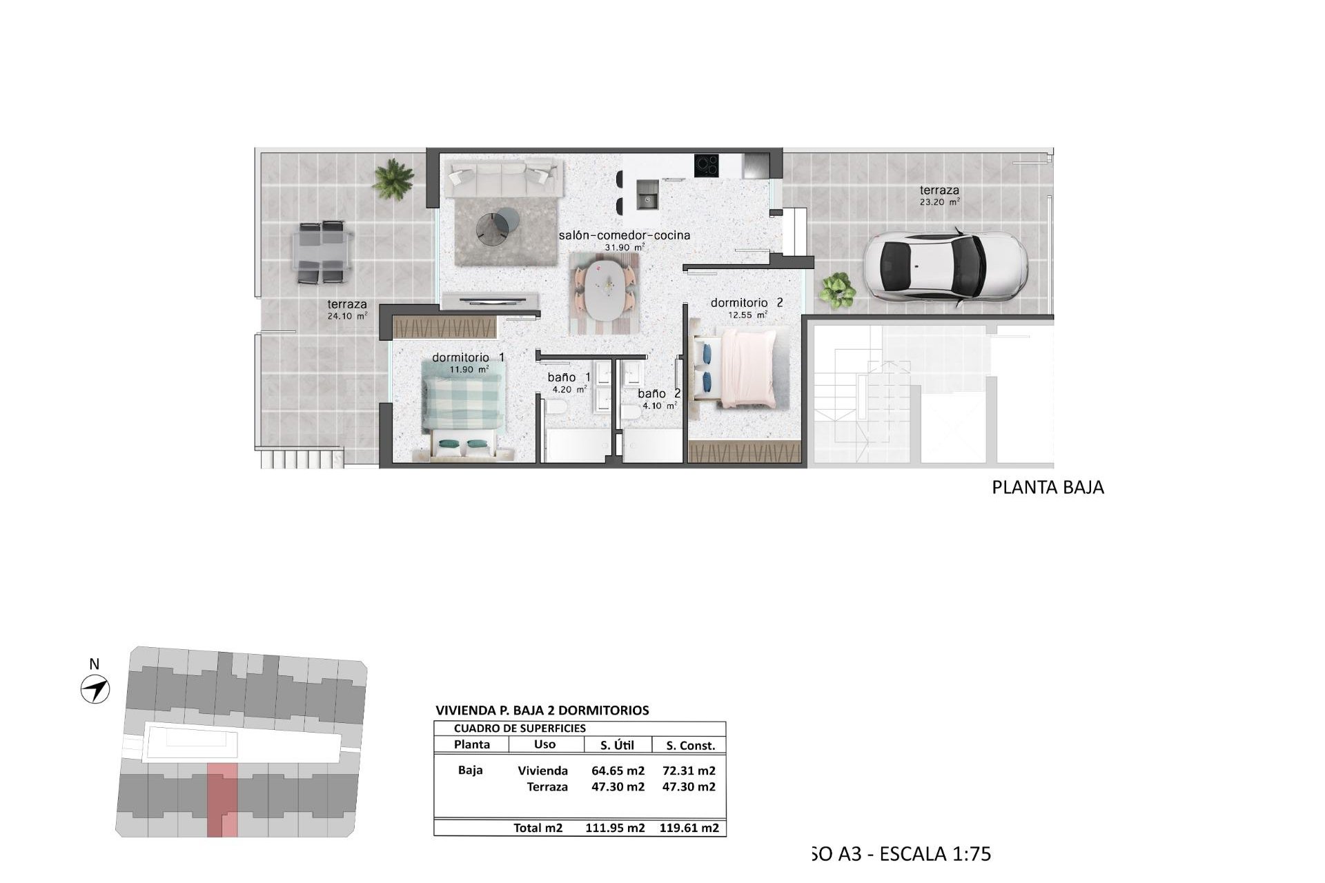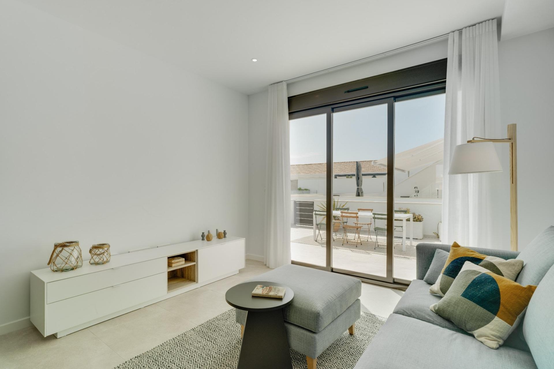 RESIDENCIAL DE OBRA NUEVA DE BUNGALOWS EN PILAR DE LA HORADADA Exclusivo residencial de obra nueva de 16 modernos bungalows en Pilar de la Horadada. Puede elegir bungalows de 2 ó 3 dormitorios con 2 baños. Las unidades de planta baja tienen grandes terrazas delanteras y traseras y acceso directo a la piscina comunitaria y jardín, las propiedades de la planta superior tienen un solarium muy grande en la azotea. El espacio habitable consta de un gran salón / comedor y cocina totalmente equipada con grandes puertas correderas que incorporan el espacio exterior. Los dormitorios tienen armarios empotrados. Los baños con calefacción por suelo radiante. Instalación de aire acondicionado. Todas las viviendas disponen de plaza de aparcamiento privada. Pilar de la Horadada es un típico pueblo español en la parte más meridional de la Costa Blanca. La gran calle principal tiene supermercados, muchas tiendas, restaurantes y bares y algunas plazas encantadoras. Las hermosas playas de Torre de la Horadada y Mil Palmeras con paseo marítimo de arena fina está a sólo 5 minutos. Los aeropuertos de Corvera (Murcia) y Alicante están respectivamente a 40 y 55 minutos.
