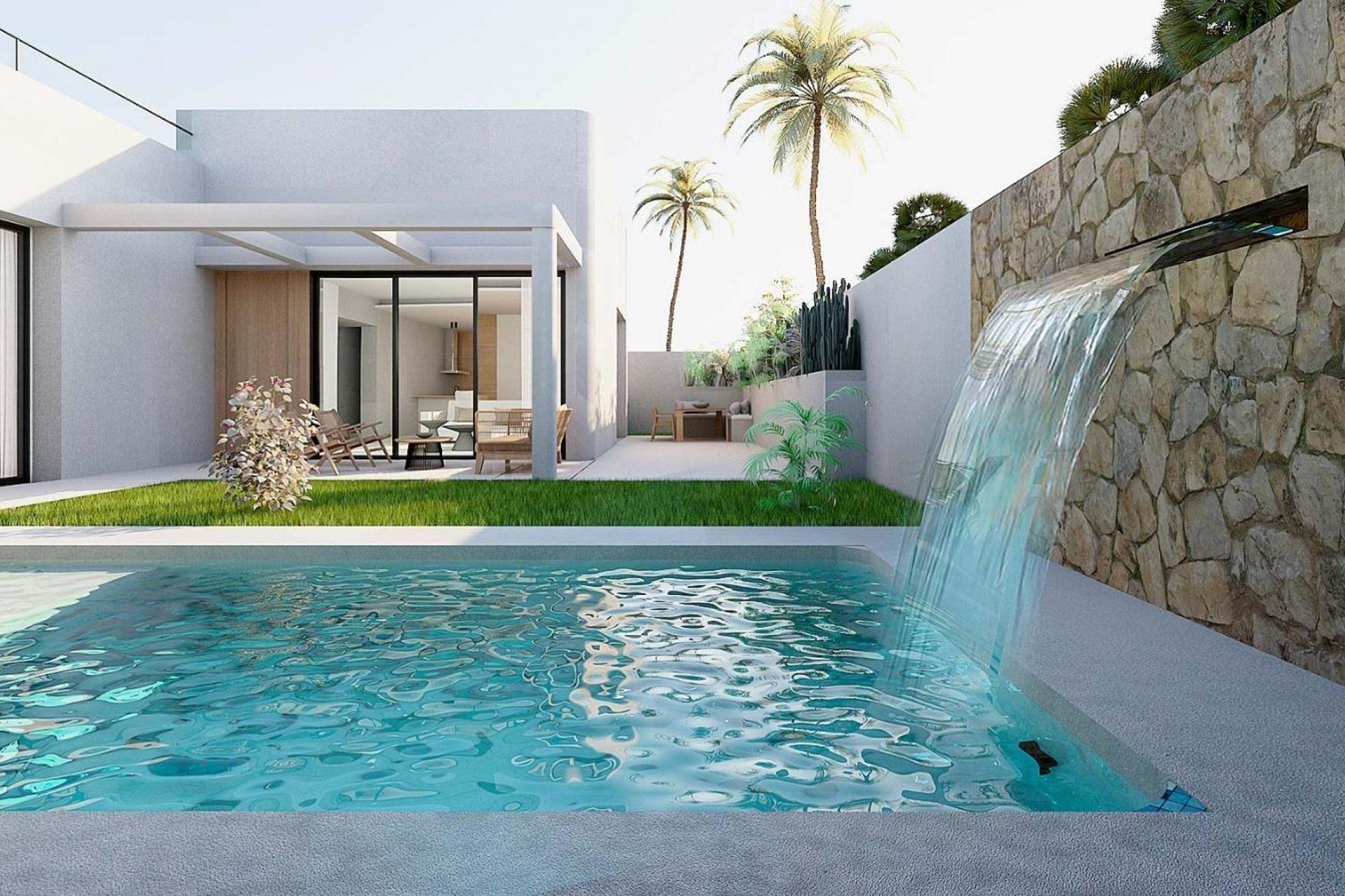 VILLAS DE OBRA NUEVA EN ROJALES Residencial exclusivo de obra nueva con solo 4 villas independientes, situado junto al campo de Golf La Marquesa en Rojales. Las villas se distribuyen en una sola planta principal, con 2 amplios dormitorios, 2 baños, y una cocina integrada en el luminoso salón que da acceso a la zona de jardín y piscina. Los chalets cuentan además con un solarium de 60 metros, acabado con césped artificial y balaustrada de cristal, fabuloso sótano del que disponen las viviendas, de más de 80 metros, que cuenta con lavadero y dos patios ingleses que aportan luz y ventilación natural. Descubre este pueblo tradicionalmente agrícola que se ha convertido en uno de los destinos preferidos del interior de la Vega Baja, gracias a su estratégica ubicación junto a la N-332 y la AP-7. Sus excelentes accesos permiten llegar al aeropuerto de Alicante en 20 minutos y disfrutar de las playas de Guardamar, La Mata o Torrevieja en 15 minutos. Rojales ofrece una rica y variada oferta gastronómica y de ocio, y cuenta con el prestigioso campo de golf de 18 hoyos La Marquesa Golf.